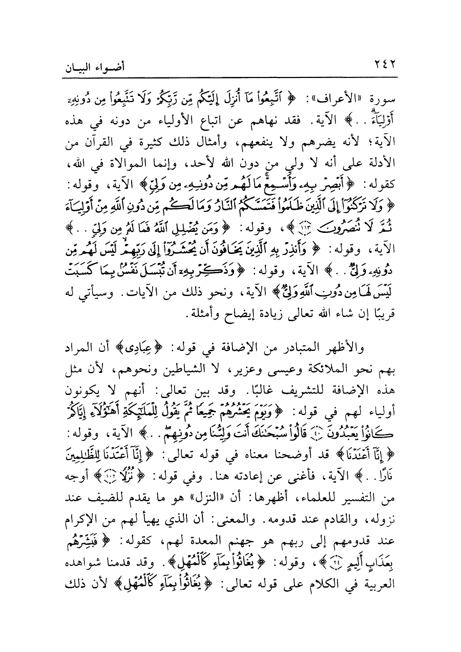 سورة "الأعراف": {اتَّبِعُوا مَا أُنْزِلَ إِلَيكُمْ مِنْ رَبِّكُمْ وَلَا تَتَّبِعُوا مِنْ دُونِهِ أَوْلِيَاءَ .. } الآية. فقد نهاهم عن اتباع الأولياء من دونه في هذه الآية؛ لأنه يضرهم ولا ينفعهم، وأمثال ذلك كثيرة في القرآن من الأدلة على أنه لا ولي مني دون الله لأحد، وإنما الموالاة في الله، كقوله: {أَبْصِرْ بِهِ وَأَسْمِعْ مَا لَهُمْ مِنْ دُونِهِ مِنْ وَلِيٍّ} الآية، وقوله: {وَلَا تَرْكَنُوا إِلَى الَّذِينَ ظَلَمُوا فَتَمَسَّكُمُ النَّارُ وَمَا لَكُمْ مِنْ دُونِ اللَّهِ مِنْ أَوْلِيَاءَ ثُمَّ لَا تُنْصَرُونَ (١١٣)}، وقوله: {وَمَنْ يُضْلِلِ اللَّهُ فَمَا لَهُ مِنْ وَلِيٍّ .. } الآية، وقوله: {وَأَنْذِرْ بِهِ الَّذِينَ يَخَافُونَ أَنْ يُحْشَرُوا إِلَى رَبِّهِمْ لَيسَ لَهُمْ مِنْ دُونِهِ وَلِيٌّ .. } الآية، وقوله: {وَذَكِّرْ بِهِ أَنْ تُبْسَلَ نَفْسٌ بِمَا كَسَبَتْ لَيسَ لَهَا مِنْ دُونِ اللَّهِ وَلِيٌّ} الآية، ونحو ذلك من الآيات. وسيأتي له قريبًا إن شاء الله تعالى زيادة إيضاح وأمثلة.