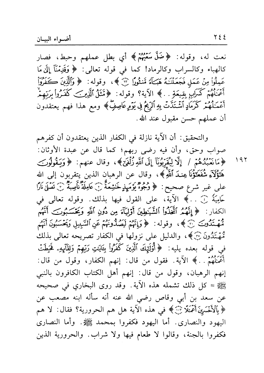 والتحقيق: أن الآية نازلة في الكفار الذين يعتقدون أن كفرهم صواب وحق، وأن فيه رضي ربهم؛ كما قال عن عبدة الأوثان: {مَا نَعْبُدُهُمْ إلا لِيُقَرِّبُونَا إِلَى اللَّهِ زُلْفَى}، وقال عنهم: {وَيَقُولُونَ هَؤُلَاءِ شُفَعَاؤُنَا عِنْدَ اللَّهِ} وقال عن الرهبان الذين يتقربون إلى الله على غير شرع صحيح: {وُجُوهٌ يَوْمَئِذٍ خَاشِعَةٌ (٢) عَامِلَةٌ نَاصِبَةٌ (٣) تَصْلَى نَارًا حَامِيَةً (٤) .. } الآية، على القول فيها بذلك. وقوله تعالى في الكفار: {إِنَّهُمُ اتَّخَذُوا الشَّيَاطِينَ أَوْلِيَاءَ مِنْ دُونِ اللَّهِ وَيَحْسَبُونَ أَنَّهُمْ مُهْتَدُونَ (٣٠)}، وقوله: {وَإِنَّهُمْ لَيَصُدُّونَهُمْ عَنِ السَّبِيلِ وَيَحْسَبُونَ أَنَّهُمْ مُهْتَدُونَ (٣٧)}، والدليل على نزولها في الكفار تصريحه تعالى بذلك في قوله بعده يليه: {أُولَئِكَ الَّذِينَ كَفَرُوا بِآيَاتِ رَبِّهِمْ وَلِقَائِهِ فَحَبِطَتْ أَعْمَالُهُمْ .. } الآية. فقول من قال: إنهم الكفار، وقول من قال: إنهم الرهبان، وقول من قال: إنهم أهل الكتاب الكافرون بالنبي - صلى الله عليه وسلم - = كل ذلك تشمله هذه الآية. وقد روى البخاري في صحيحه عن سعد بن أبي وقاص رضي الله عنه أنه سأله ابنه مصعب عن {بِالْأَخْسَرِينَ أَعْمَالًا (١٠٣)} في هذه الآية هل هم الحرورية؟ فقال: لا هم اليهود والنصارى. أما اليهود فكفروا بمحمد - صلى الله عليه وسلم -. وأما النصارى فكفروا بالجنة، وقالوا لا طعام فيها ولا شراب. والحرورية الذين