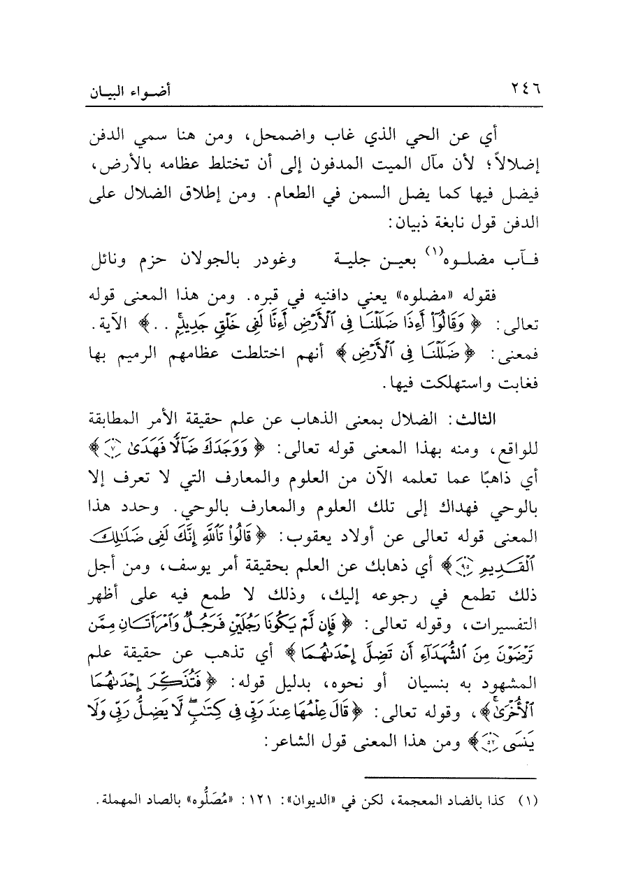 الثالث: الضلال بمعنى الذهاب عن علم حقيقة الأمر المطابقة للواقع، ومنه بهذا المعنى قوله تعالى: {وَوَجَدَكَ ضَالًّا فَهَدَى (٧) } أي ذاهبًا عما تعلمه الآن من العلوم والمعارف التي لا تعرف إلا بالوحي فهداك إلى تلك العلوم والمعارف بالوحي. وحدد هذا المعنى قوله تعالى عن أولاد يعقوب: {قَالُوا تَاللَّهِ إِنَّكَ لَفِي ضَلَالِكَ الْقَدِيمِ (٩٥) } أي ذهابك عن العلم بحقيقة أمر يوسف، ومن أجل ذلك تطمع في رجوعه إليك، وذلك لا طمع فيه على أظهر التفسيرات، وقوله تعالى: {فَإِنْ لَمْ يَكُونَا رَجُلَينِ فَرَجُلٌ وَامْرَأَتَانِ مِمَّنْ تَرْضَوْنَ مِنَ الشُّهَدَاءِ أَنْ تَضِلَّ إِحْدَاهُمَا} أي تذهب عن حقيقة علم المشهود به بنسيان أو نحوه، بدليل قوله: {فَتُذَكِّرَ إِحْدَاهُمَا الْأُخْرَى}، وقوله تعالى: {قَال عِلْمُهَا عِنْدَ رَبِّي فِي كِتَابٍ لَا يَضِلُّ رَبِّي وَلَا يَنْسَى (٥٢) } ومن هذا المعنى قول الشاعر: