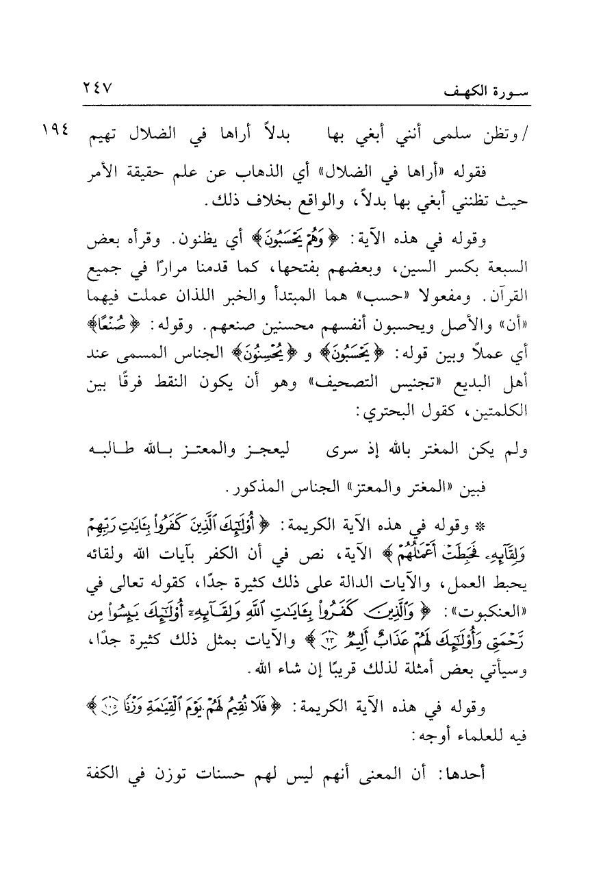 وقوله في هذه الآية: {وَهُمْ يَحْسَبُونَ} أي يظنون. وقرأه بعض السبعة بكسر السين، وبعضهم بفتحها، كما قدمنا مرارًا في جميع القرآن. ومفعولا "حسب" هما المبتدأ والخبر اللذان عملت فيهما "أن" والأصل ويحسبون أنفسهم محسنين صنعهم. وقوله: {صُنْعًا} أي عملًا وبين قوله: {يَحْسَبُونَ} و {يُحْسِنُونَ} الجناس المسمى عند أهل البديع "تجنيس التصحيف" وهو أن يكون النقط فرقًا بين الكلمتين، كقول البحتري: