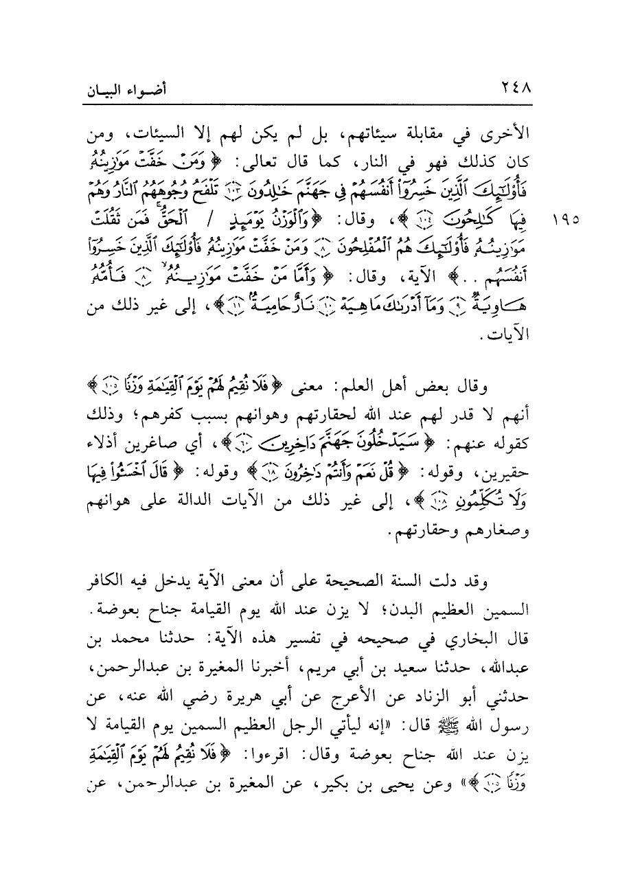وقد دلت السنة الصحيحة على أن معنى الآية يدخل فيه الكافر السمين العظيم البدن؛ لا يزن عند الله يوم القيامة جناح بعوضة. قال البخاري في صحيحه في تفسير هذه الآية: حدثنا محمد بن عبد الله، حدثنا سعيد بن أبي مريم، أخبرنا المغيرة بن عبد الرحمن، حدثني أبو الزناد عن الأعرج عن أبي هريرة رضي الله عنه، عن رسول الله - صلى الله عليه وسلم - قال: "إنه ليأتي الرجل العظيم السمين يوم القيامة لا يزن عند الله جناح بعوضة وقال: اقرءوا: {فَلَا نُقِيمُ لَهُمْ يَوْمَ الْقِيَامَةِ وَزْنًا (١٠٥)}" وعن يحيى بن بكير، عن المغيرة بن عبد الرحمن، عن
