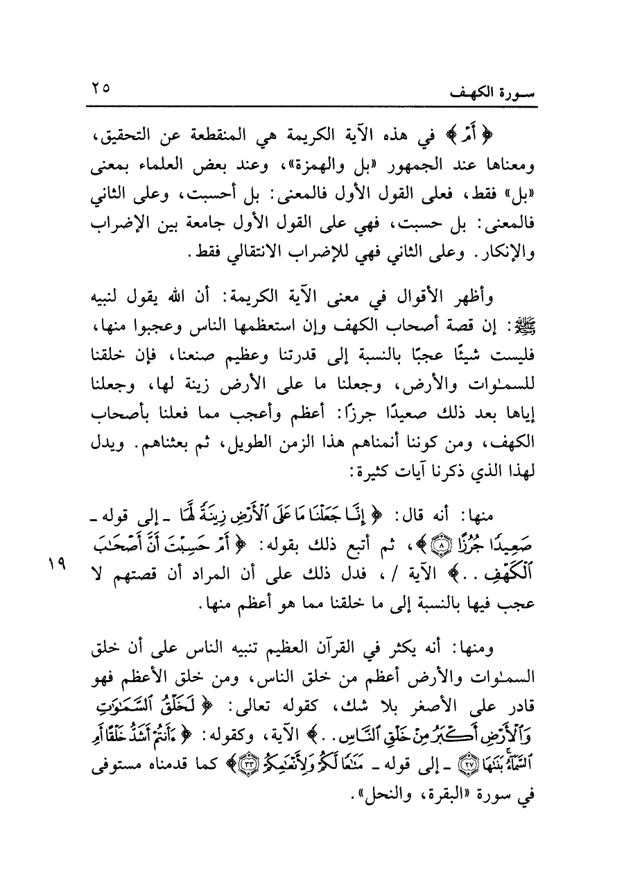 وأظهر الأقوال في معنى الآية الكريمة: أن الله يقول لنبيه - صلى الله عليه وسلم -: إن قصة أصحاب الكهف وإن استعظمها الناس وعجبوا منها، فليست شيئًا عجبًا بالنسبة إلى قدرتنا وعظيم صنعنا، فإن خلقنا للسموات والأرض، وجعلنا ما على الأرض زينة لها، وجعلنا إياها بعد ذلك صعيدًا جرزا: أعظم وأعجب مما فعلنا بأصحاب الكهف، ومن كوننا أنمناهم هذا الزمن الطويل، ثم بعثناهم. ويدل لهذا الذي ذكرنا آيات كثيرة: