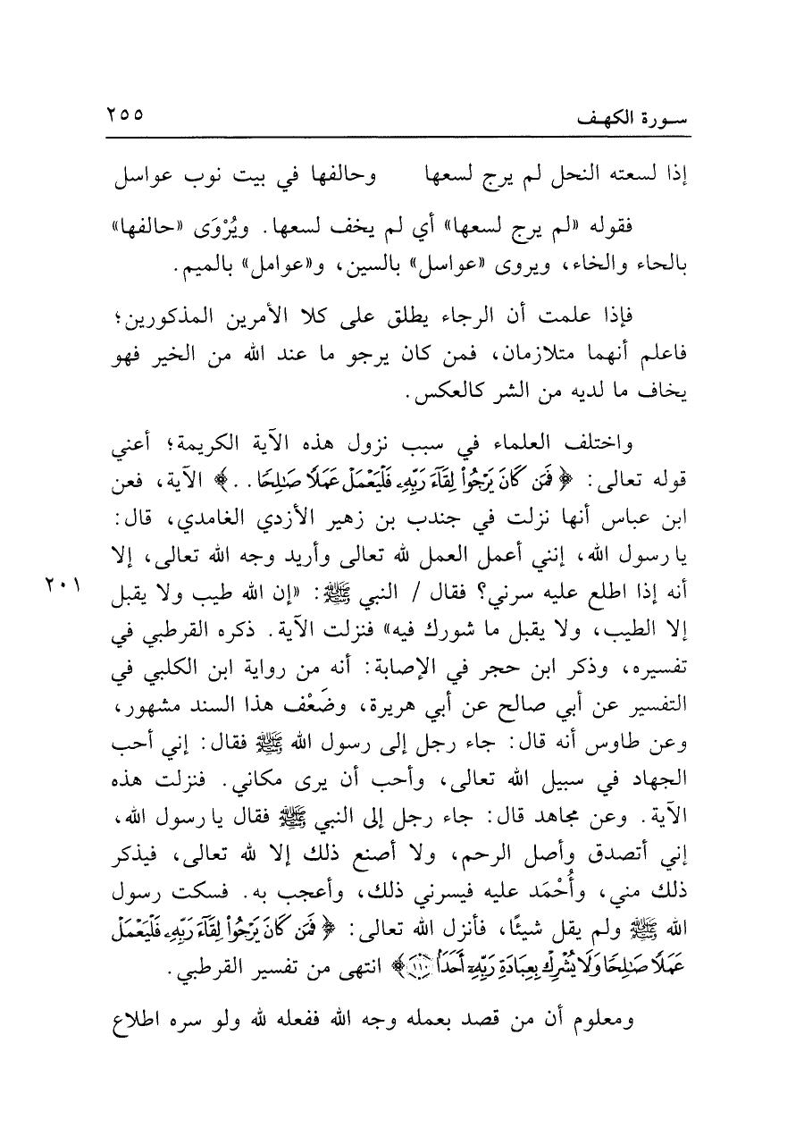 واختلف العلماء في سبب نزول هذه الآية الكريمة، أعني قوله تعالى: {فَمَنْ كَانَ يَرْجُو لِقَاءَ رَبِّهِ فَلْيَعْمَلْ عَمَلًا صَالِحًا .. } الآية، فعن ابن عباس أنها نزلت في جندب بن زهير الأزدي الغامدي، قال: يا رسول الله، إنني أعمل العمل لله تعالى وأريد وجه الله تعالى، إلا أنه إذا اطلع عليه سرني؟ فقال النبي - صلى الله عليه وسلم -: "إن الله طيب ولا يقبل إلا الطيب، ولا يقبل ما شورك فيه" فنزلت الآية. ذكره القرطبي في تفسيره، وذكر ابن حجر في الإصابة: أنه من رواية ابن الكلبي في التفسير عن أبي صالح عن أبي هريرة، وضَعْف هذا السند مشهور، وعن طاوس أنه قال: جاء رجل إلى رسول الله - صلى الله عليه وسلم - فقال: إني أحب الجهاد في سبيل الله تعالى، وأحب أن يرى مكاني. فنزلت هذه الآية. وعن مجاهد قال: جاء رجل إلى النبي - صلى الله عليه وسلم - فقال يا رسول الله، إني أتصدق وأصل الرحم، ولا أصنع ذلك إلا لله تعالى، فيذكر ذلك مني، وأُحْمَد عليه فيسرني ذلك، وأعجب به. فسكت رسول الله - صلى الله عليه وسلم - ولم يقل شيئًا، فأنزل الله تعالى: {فَمَنْ كَانَ يَرْجُو لِقَاءَ رَبِّهِ فَلْيَعْمَلْ عَمَلًا صَالِحًا وَلَا يُشْرِكْ بِعِبَادَةِ رَبِّهِ أَحَدًا (١١٠)} انتهى من تفسير القرطبي.