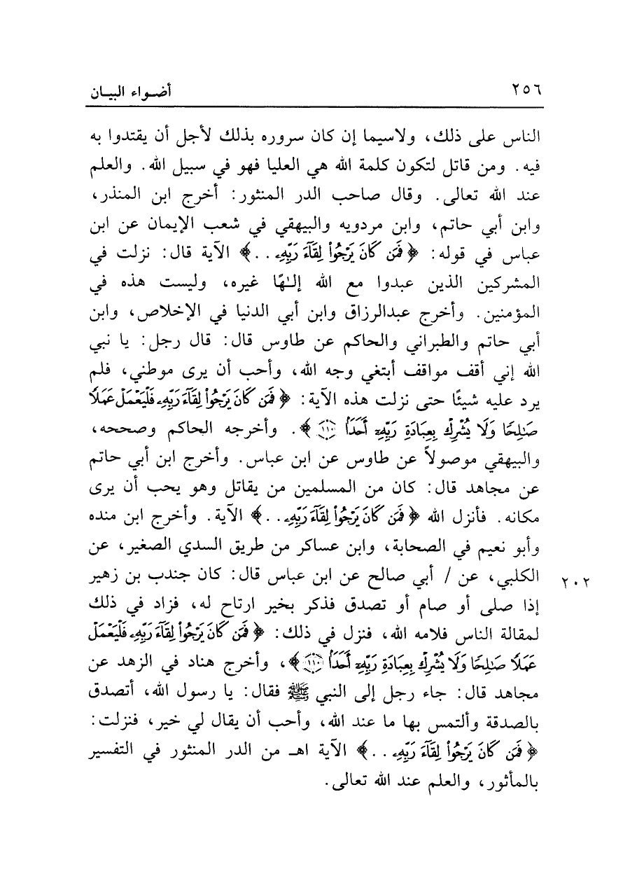 الناس على ذلك، ولاسيما إن كان سروره بذلك لأجل أن يقتدوا به فيه. ومن قاتل لتكون كلمة الله هي العليا فهو في سبيل الله. والعلم عند الله تعالى. وقال صاحب الدر المنثور: أخرج ابن المنذر، وابن أبي حاتم، وابن مردويه والبيهقي في شعب الإيمان عن ابن عباس في قوله: {فَمَنْ كَانَ يَرْجُو لِقَاءَ رَبِّهِ .. } الآية قال: نزلت في المشركين الذين عبدوا مع الله إلاهًا غيره، وليست هذه في المؤمنين. وأخرج عبد الرزاق وابن أبي الدنيا في الإخلاص، وابن أبي حاتم والطبراني والحاكم عن طاوس قال: قال رجل: يا نبي الله إني أقف مواقف أبتغي وجه الله، وأحب أن يرى موطني، فلم يرد عليه شيئًا حتى نزلت هذه الآية: {فَمَنْ كَانَ يَرْجُو لِقَاءَ رَبِّهِ فَلْيَعْمَلْ عَمَلًا صَالِحًا وَلَا يُشْرِكْ بِعِبَادَةِ رَبِّهِ أَحَدًا (١١٠)}. وأخرجه الحاكم وصححه، والبيهقي موصولًا عن طاوس عن ابن عباس. وأخرج ابن أبي حاتم عن مجاهد قال: كان من المسلمين من يقاتل وهو يحب أن يرى مكانه. فأنزل الله {فَمَنْ كَانَ يَرْجُو لِقَاءَ رَبِّهِ .. } الآية. وأخرج ابن منده وأبو نعيم في الصحابة، وابن عساكر من طريق السدي الصغير، عن الكلبي، عن أبي صالح عن ابن عباس قال: كان جندب بن زهير إذا صلى أو صام أو تصدق فذكر بخير ارتاح له، فزاد في ذلك لمقالة الناس فلامه الله، فنزل في ذلك: {فَمَنْ كَانَ يَرْجُو لِقَاءَ رَبِّهِ فَلْيَعْمَلْ عَمَلًا صَالِحًا وَلَا يُشْرِكْ بِعِبَادَةِ رَبِّهِ أَحَدًا (١١٠)}، وأخرج هناد في الزهد عن مجاهد قال: جاء رجل إلى النبي - صلى الله عليه وسلم - فقال: يا رسول الله، أتصدق بالصدقة وألتمس بها ما عند الله، وأحب أن يقال لي خير، فنزلت: {فَمَنْ كَانَ يَرْجُو لِقَاءَ رَبِّهِ .. } الآية اهـ من الدر المنثور في التفسير بالمأثور، والعلم عند الله تعالى.