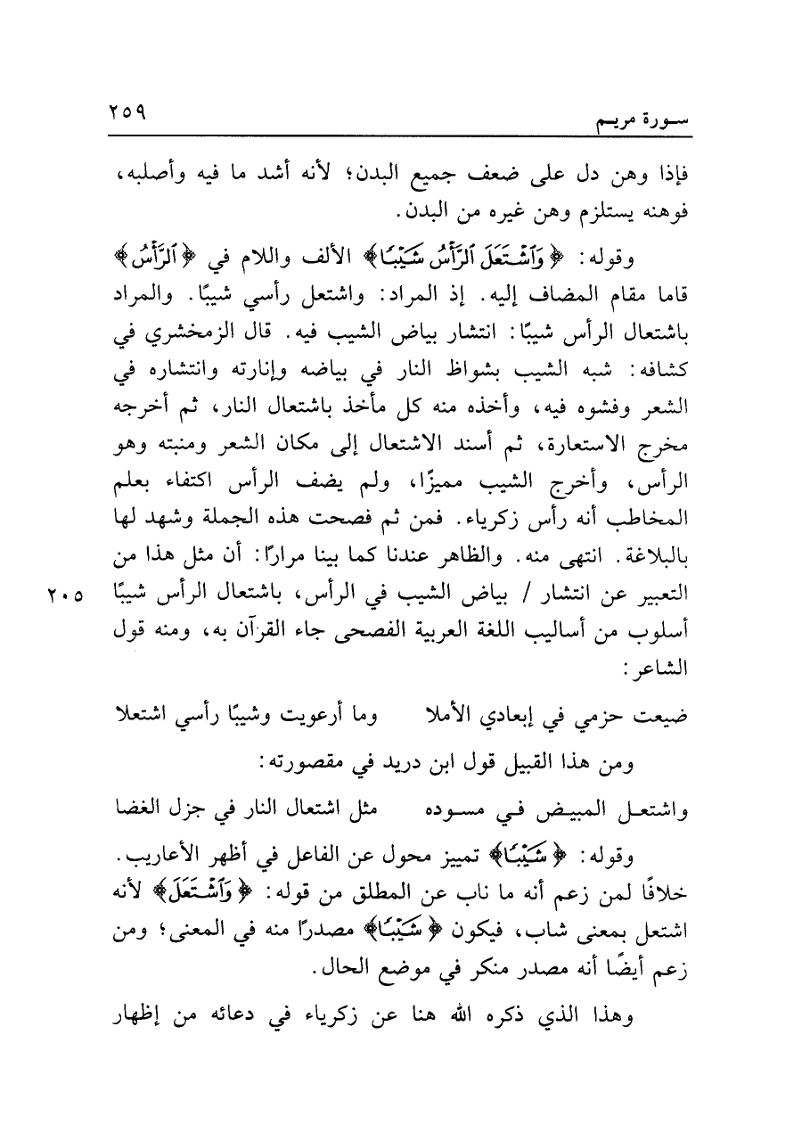 وقوله: {وَاشْتَعَلَ الرَّأْسُ شَيبًا} الألف واللام في {الرَّأْسُ} قاما مقام المضاف إليه. إذ المراد: واشتعل رأسي شيبًا. والمراد باشتعال الرأس شيبًا: انتشار بياض الشيب فيه. قال الزمخشري في كشافه؛ شبه الشيب بشواظ النار في بياضه وإنارته وانتشاره في الشعر وفشوه فيه، وأخذه منه كل مأخذ باشتعال النار، ثم أخرجه مخرج الاستعارة، ثم أسند الاشتعال إلى مكان الشعر ومنبته وهو الرأس وأخرج الشيب مميزًا، ولم يضف الرأس اكتفاء بعلم المخاطب أنه رأس زكرياء. فمن ثم فصحت هذه الجملة وشهد لها بالبلاغة. انتهى منه. والظاهر عندنا كما بينا مرارًا: أن مثل هذا من التعبير عن انتشار بياض الشيب في الرأس باشتعال الرأس شيبًا أسلوب من أساليب اللغة العربية الفصحى جاء القرآن به، ومنه قول الشاعر: