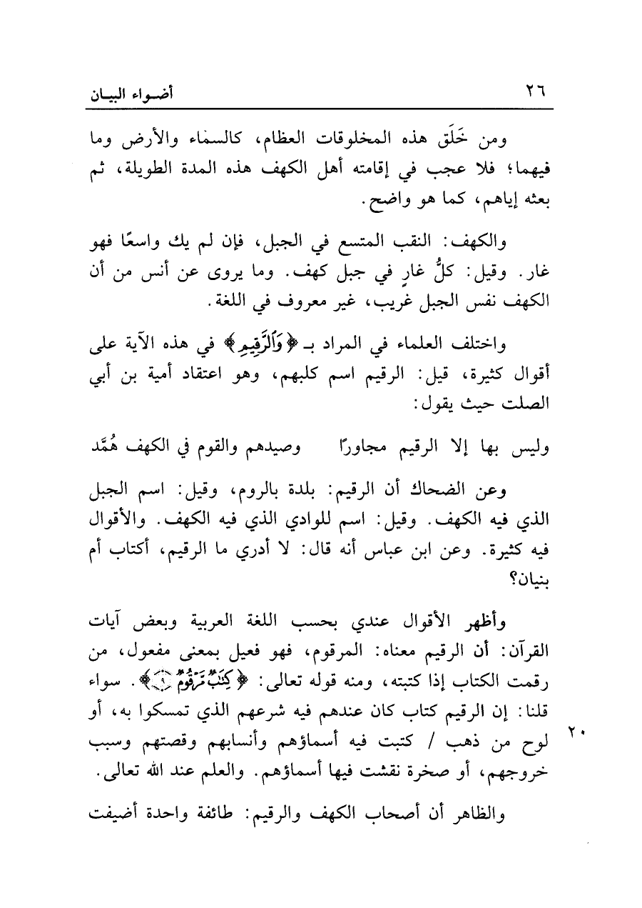 وأظهر الأقوال عندي بحسب اللغة العربية وبعض آيات القرآن: أن الرقيم معناه: المرقوم، فهو فعيل بمعنى مفعول، من رقمت الكتاب إذا كتبته، ومنه قوله تعالى: {كِتَابٌ مَرْقُومٌ (٩)}. سواء قلنا: إن الرقيم كتاب كان عندهم فيه شرعهم الذي تمسكوا به، أو لوح من ذهب كتبت فيه أسماؤهم وأنسابهم وقصتهم وسبب خروجهم، أو صخرة نقشت فيها أسماؤهم. والعلم عند الله تعالى.