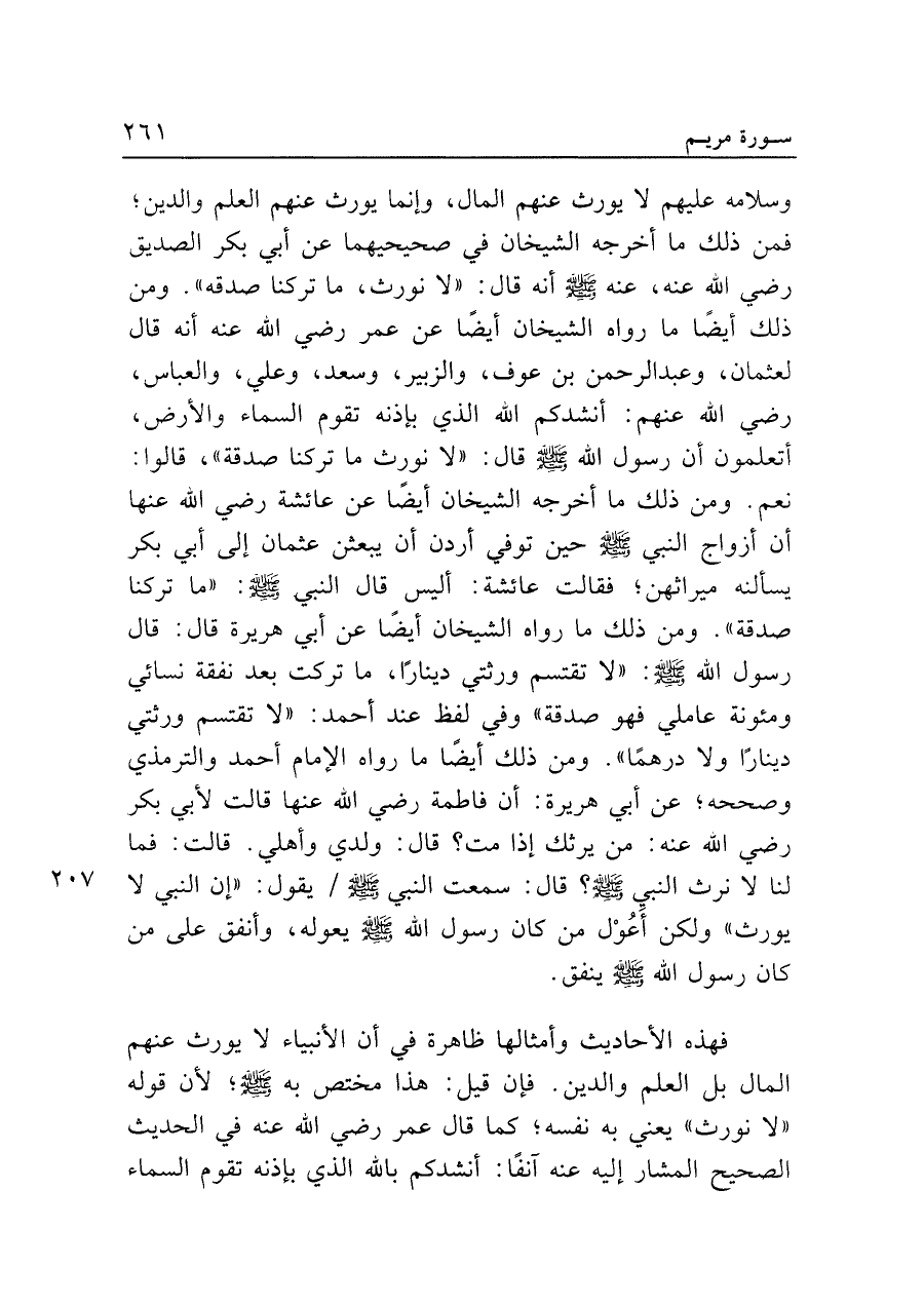 فهذه الأحاديث وأمثالها ظاهرة في أن الأنبياء لا يورث عنهم المال بل العلم والدين. فإن قيل: هذا مختص به - صلى الله عليه وسلم -؛ لأن قوله "لا نورث" يعني به نفسه؛ كما قال عمر رضي الله عنه في الحديث الصحيح المشار إليه عنه آنفًا: أنشدكم بالله الذي بإذنه تقوم السماء
