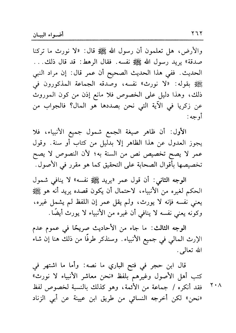 الوجه الثاني: أن قول عمر "يريد - صلى الله عليه وسلم - نفسه" لا ينافي شمول الحكم لغيره من الأنبياء، لاحتمال أن يكون قصده يريد أنه هو - صلى الله عليه وسلم - يعني نفسه فإنه لا يورث، ولم يقل عمر إن اللفظ لم يشمل غيره، وكونه يعني نفسه لا ينافي أن غيره من الأنبياء لا يورث أيضًا.