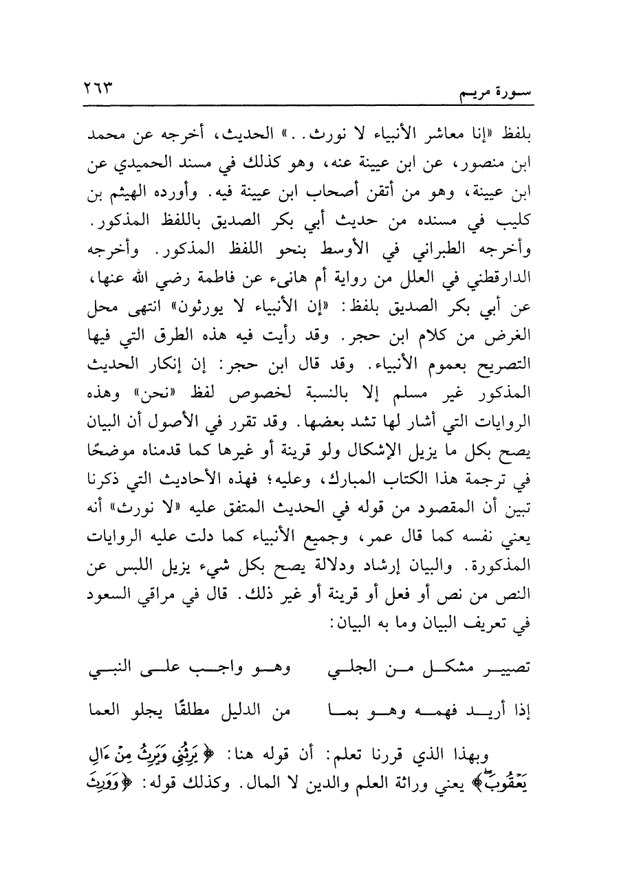 بلفظ "إنا معاشر الأنبياء لا نورث. ." الحديث، أخرجه عن محمد بن منصور، عن ابن عيينة عنه، وهو كذلك في مسند الحميدي عن ابن عيينة، وهو من أتقن أصحاب ابن عيينة فيه. وأورده الهيثم بن كليب في مسنده من حديث أبي بكر الصديق باللفظ المذكور. وأخرجه الطبراني في الأوسط بنحو اللفظ المذكور. وأخرجه الدارقطني في العلل من رواية أم هانئ عن فاطمة رضي الله عنها، عن أبي بكر الصديق بلفظ: "إن الأنبياء لا يورثون" انتهى محل الغرض من كلام ابن حجر. وقد رأيت فيه هذه الطرق التي فيها التصريح بعموم الأنبياء. وقد قال ابن حجر: إن إنكار الحديث المذكور غير مسلم إلا بالنسبة لخصوص لفظ "نحن" وهذه الروايات التي أشار لها تشد بعضها. وقد تقرر في الأصول أن البيان يصح بكل ما يزيل الإشكال ولو قرينة أو غيرها كما قدمناه موضحًا في ترجمة هذا الكتاب المبارك، وعليه؛ فهذه الأحاديث التي ذكرنا تبين أن المقصود من قوله في الحديث المتفق عليه "لا نورث" أنه يعني نفسه كما قال عمر، وجميع الأنبياء كما دلت عليه الروايات المذكورة. والبيان إرشاد ودلالة يصح بكل شيء يزيل اللبس عن النص من نص أو فعل أو قرينة أو غير ذلك. قال في مراقي السعود في تعريف البيان وما به البيان: