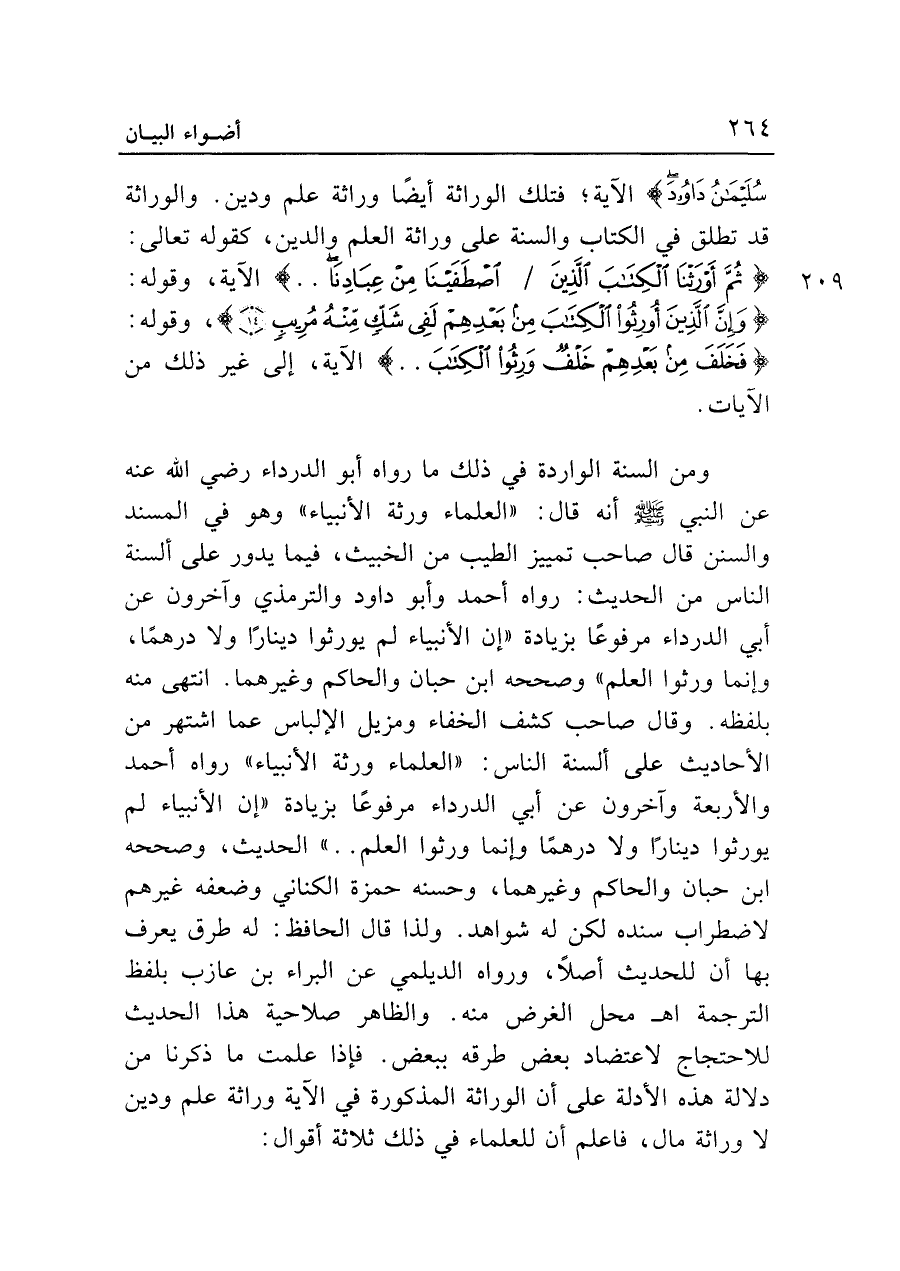 ومن السنة الواردة في ذلك ما رواه أبو الدرداء رضي الله عنه عن النبي - صلى الله عليه وسلم - أنه قال: "العلماء ورثة الأنبياء" وهو في المسند والسنن قال صاحب تمييز الطيب من الخبيث، فيما يدور على ألسنة الناس من الحديث: رواه أحمد وأبو داود والترمذي وآخرون عن أبي الدرداء مرفوعًا بزيادة "إن الأنبياء لم يورثوا دينارًا ولا درهمًا، وإنما ورثوا العلم" وصححه ابن حبان والحاكم وغيرهما. انتهى منه بلفظه. وقال صاحب كشف الخفاء ومزيل الإلباس عما اشتهر من الأحاديث على ألسنة الناس: "العلماء ورثة الأنبياء" رواه أحمد والأربعة وآخرون عن أبي الدرداء مرفوعًا بزيادة "إن الأنبياء لم يورثوا دينارًا ولا درهمًا وإنما ورثوا العلم. ." الحديث، وصححه ابن حبان والحاكم وغيرهما، وحسنه حمزة الكناني وضعفه غيرهم لاضطراب سنده لكن له شواهد. ولذا قال الحافظ: له طرق يعرف بها أن للحديث أصلًا، ورواه الديلمي عن البراء بن عازب بلفظ الترجمة اهـ محل الغرض منه. والظاهر صلاحية هذا الحديث للاحتجاج لاعتضاد بعض طرقه ببعض. فإذا علمت ما ذكرنا من دلالة هذه الأدلة على أن الوراثة المذكورة في الآية وراثة علم ودين لا وراثة مال، فاعلم أن للعلماء في ذلك ثلاثة أقوال: