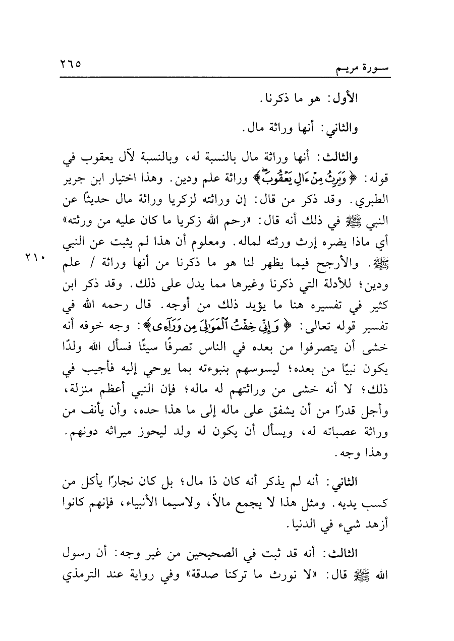 والثالث: أنها وراثة مال بالنسبة له، وبالنسبة لآل يعقوب في قوله: {وَيَرِثُ مِنْ آلِ يَعْقُوبَ} وراثة علم ودين. وهذا اختيار ابن جرير الطبري. وقد ذكر من قال: إن وراثته لزكريا وراثة مال حديثًا عن النبي - صلى الله عليه وسلم - في ذلك أنه قال: "رحم الله زكريا ما كان عليه من ورثته" أي ماذا يضره إرث ورثته لماله. ومعلوم أن هذا لم يثبت عن النبي - صلى الله عليه وسلم -. والأرجح فيما يظهر لنا هو ما ذكرنا من أنها وراثة علم ودين؛ للأدلة التي ذكرنا وغيرها مما يدل على ذلك. وقد ذكر ابن كثير في تفسيره هنا ما يؤيد ذلك من أوجه. قال رحمه الله في تفسير قوله تعالى: {وَإِنِّي خِفْتُ الْمَوَالِيَ مِنْ وَرَائِي}: وجه خوفه أنه خشى أن يتصرفوا من بعده في الناس تصرفًا سيئًا فسأل الله ولدًا يكون نبيًّا من بعده؛ ليسوسهم بنبوءته بما يوحي إليه فأجيب في ذلك؛ لا أنه خشى من وراثتهم له ماله؛ فإن النبي أعظم منزلة، وأجل قدرًا من أن يشفق على ماله إلى ما هذا حده، وأن يأنف من وراثة عصباته له، ويسأل أن يكون له ولد ليحوز ميراثه دونهم. وهذا وجه.