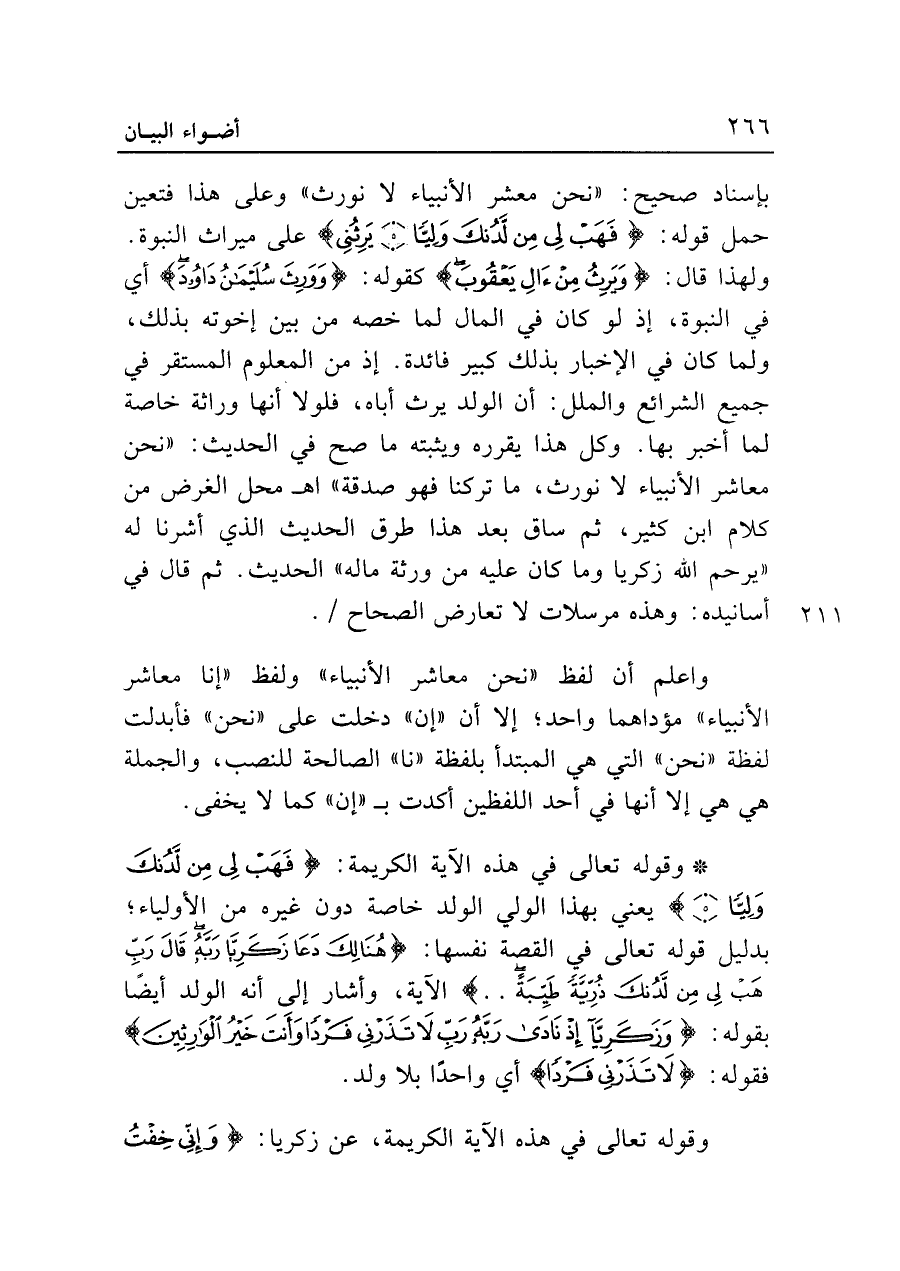 بإسناد صحيح: "نحن معشر الأنبياء لا نورث" وعلى هذا فتعين حمل قوله: {فَهَبْ لِي مِنْ لَدُنْكَ وَلِيًّا (٥) يَرِثُنِي} على ميراث النبوة. ولهذا قال {وَيَرِثُ مِنْ آلِ يَعْقُوبَ} كقوله: {وَوَرِثَ سُلَيمَانُ دَاوُودَ} أي في النبوة، إذ لو كان في المال لما خصه من بين إخوته بذلك، ولما كان في الإخبار بذلك كبير فائدة. إذ من المعلوم المستقر في جميع الشرائع والملل: أن الولد يرث أباه، فلولا أنها وراثة خاصة لما أخبر بها. وكل هذا يقرره ويثبته ما صح في الحديث: "نحن معاشر الأنبياء لا نورث، ما تركنا فهو صدقة" اهـ محل الغرض من كلام ابن كثير، ثم ساق بعد هذا طرق الحديث الذي أشرنا له "يرحم الله زكريا وما كان عليه من ورثة ماله" الحديث. ثم قال في أسانيده: وهذه مرسلات لا تعارض الصحاح.