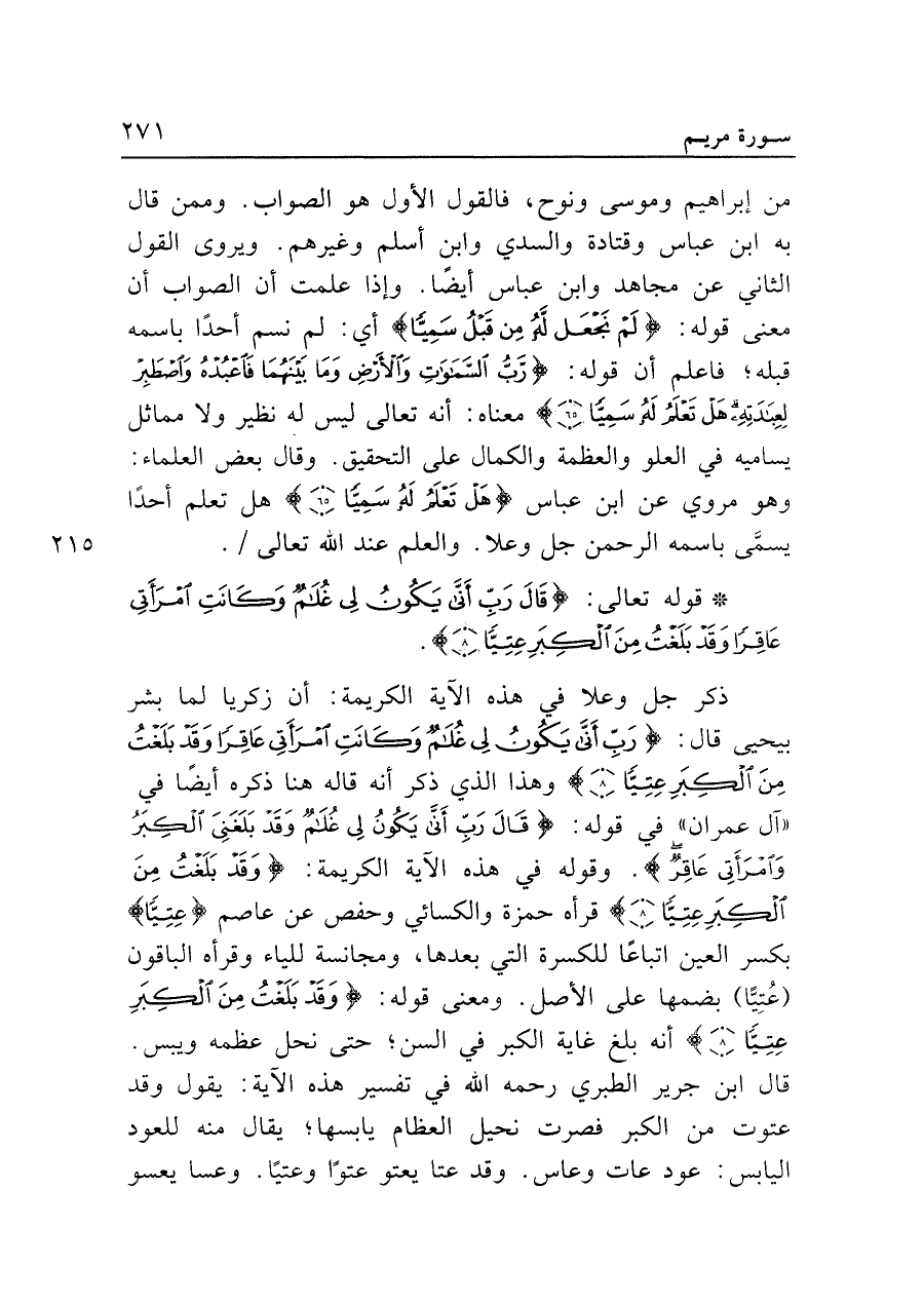 ذكر جل وعلا في هذه الآية الكريمة: أن زكريا لما بشر بيحيى قال: {قَال رَبِّ أَنَّى يَكُونُ لِي غُلَامٌ وَكَانَتِ امْرَأَتِي عَاقِرًا وَقَدْ بَلَغْتُ مِنَ الْكِبَرِ عِتِيًّا (٨)} وهذا الذي ذكر أنه قاله هنا ذكره أيضًا في "آل عمران" في قوله: {قَال رَبِّ أَنَّى يَكُونُ لِي غُلَامٌ وَقَدْ بَلَغَنِيَ الْكِبَرُ وَامْرَأَتِي عَاقِرٌ}. وقوله في هذه الآية الكريمة: {وَقَدْ بَلَغْتُ مِنَ الْكِبَرِ عِتِيًّا (٨)} قرأه حمزة والكسائي وحفص عن عاصم {عِتِيًّا} بكسر العين اتباعًا للكسرة التي بعدها، ومجانسة للياء وقرأه الباقون (عُتِيًّا) بضمها على الأصل. ومعنى قوله: {وَقَدْ بَلَغْتُ مِنَ الْكِبَرِ عِتِيًّا (٨)} أنه بلغ غاية الكبر في السن؛ حتى نحل عظمه ويبس. قال ابن جرير الطبري رحمه الله في تفسير هذه الآية: يقول وقد عتوت من الكبر فصرت نحيل العظام يابسها؛ يقال منه للعود اليابس: عود عات وعاس. وقد عتا يعتو عتوًا وعتيًا. وعسا يعسو