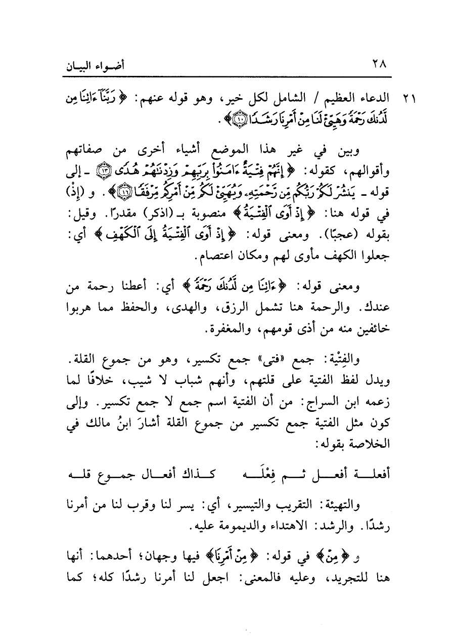 وبين في غير هذا الموضع أشياء أخرى من صفاتهم وأقوالهم، كقوله: {إِنَّهُمْ فِتْيَةٌ آمَنُوا بِرَبِّهِمْ وَزِدْنَاهُمْ هُدًى (١٣) -إلى قوله- يَنْشُرْ لَكُمْ رَبُّكُمْ مِنْ رَحْمَتِهِ وَيُهَيِّئْ لَكُمْ مِنْ أَمْرِكُمْ مِرْفَقًا (١٦)}. و ( إِذْ) في قوله هنا: {إِذْ أَوَى الْفِتْيَةُ} منصوبة بـ (اذكر) مقدرًا. وقيل: بقوله (عجبًا). ومعنى قوله: {إِذْ أَوَى الْفِتْيَةُ إِلَى الْكَهْفِ} أي: جعلوا الكهف مأوى لهم ومكان اعتصام.