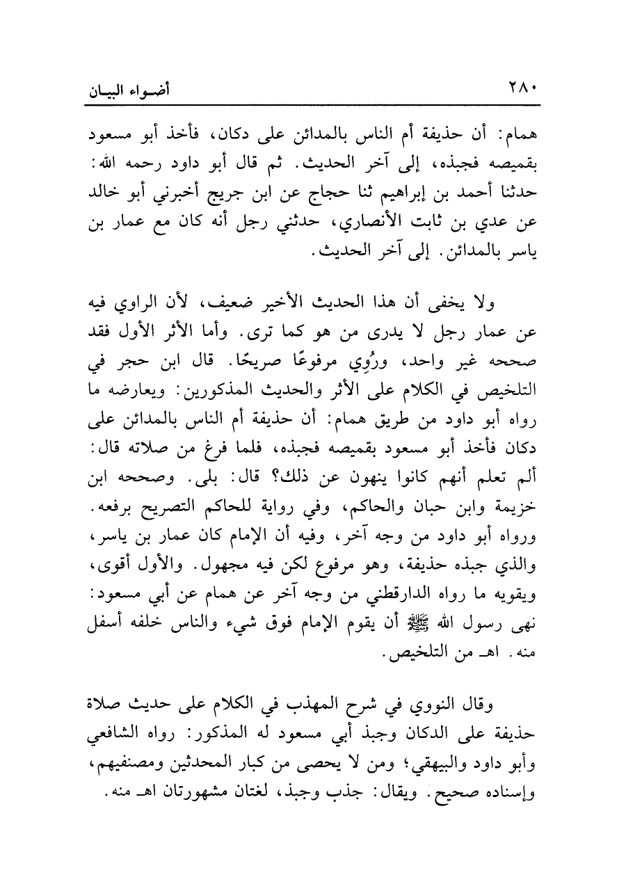 ولا يخفى أن هذا الحديث الأخير ضعيف، لأن الراوي فيه عن عمار رجل لا يدرى من هو كما ترى. وأما الأثر الأول فقد صححه غير واحد، ورُوي مرفوعًا صريحًا. قال ابن حجر في التلخيص في الكلام على الأثر والحديث المذكورين: ويعارضه ما رواه أبو داود من طريق همام: أن حذيفة أم الناس بالمدائن على دكان فأخذ أبو مسعود بقميصه فجبذه، فلما فرغ من صلاته قال: ألم تعلم أنهم كانوا ينهون عن ذلك؟ قال: بلى. وصححه ابن خزيمة وابن حبان والحاكم، وفي رواية للحاكم التصريح برفعه. ورواه أبو داود من وجه آخر، وفيه أن الإمام كان عمار بن ياسر، والذي جبذه حذيفة، وهو مرفوع لكن فيه مجهول. والأول أقوى، ويقويه ما رواه الدارقطني من وجه آخر عن همام عن أبي مسعود. نهى رسول الله - صلى الله عليه وسلم - أن يقوم الإمام فوق شيء والناس خلفه أسفل منه. اهـ من التلخيص.