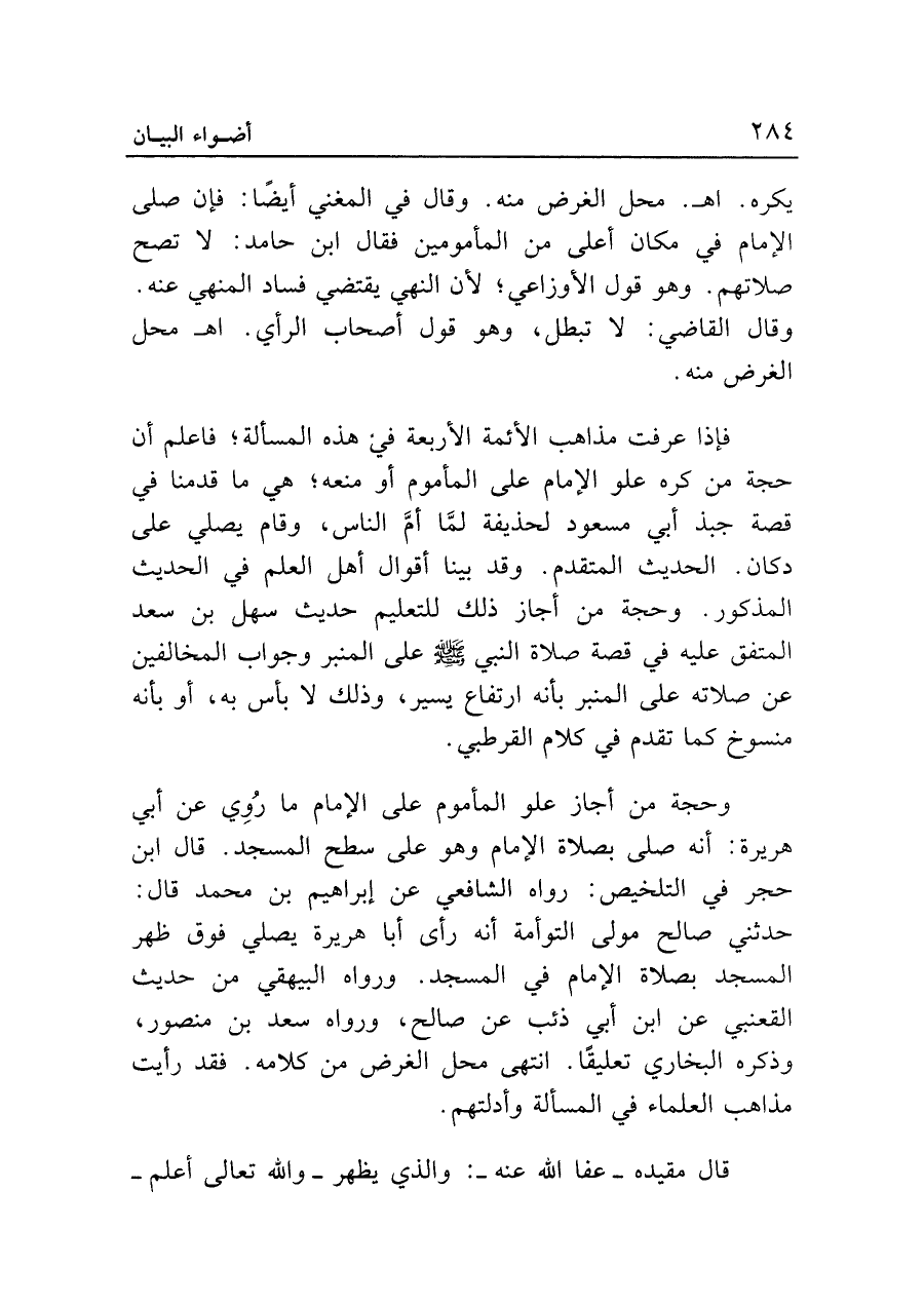 فإذا عرفت مذاهب الأئمة الأربعة في هذه المسألة؛ فاعلم أن حجة من كره علو الإمام على المأموم أو منعه؛ هي ما قدمنا في قصة جبذ أبي مسعود لحذيفة لمَّا أمَّ الناس، وقام يصلي على دكان. الحديث المتقدم. وقد بينا أقوال أهل العلم في الحديث المذكور. وحجة من أجاز ذلك للتعليم حديث سهل بن سعد المتفق عليه في قصة صلاة النبي - صلى الله عليه وسلم - على المنبر وجواب المخالفين عن صلاته على المنبر بأنه ارتفاع يسير، وذلك لا بأس به، أو بأنه منسوخ كما تقدم في كلام القرطبي.
