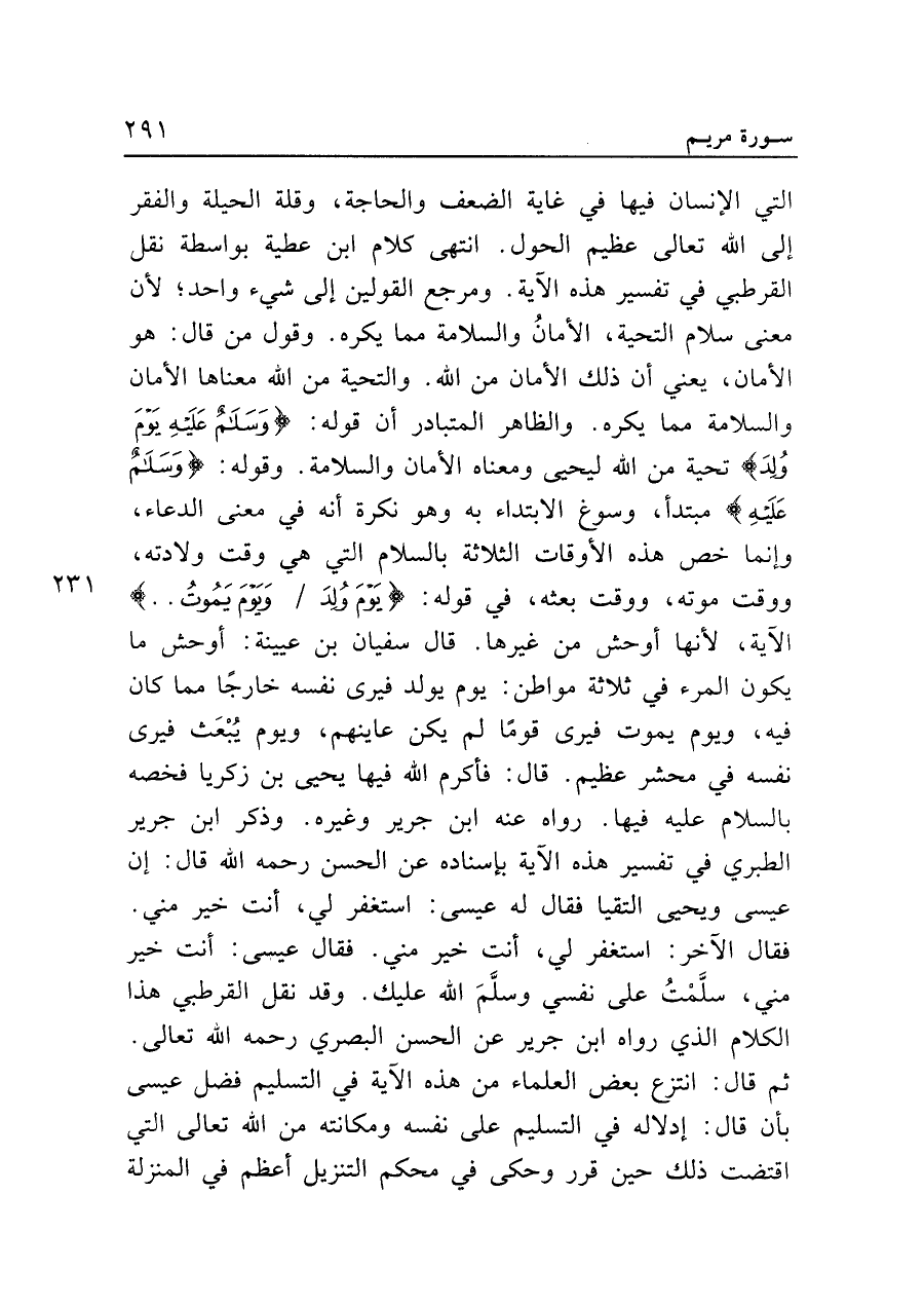 التي الإنسان فيها في غاية الضعف والحاجة، وقلة الحيلة والفقر إلى الله تعالى عظيم الحول. انتهى كلام ابن عطية بواسطة نقل القرطبي في تفسير هذه الآية. ومرجع القولين إلى شيء واحد؛ لأن معنى سلام التحية، الأمانُ والسلامة مما يكره. وقول من قال: هو الأمان، يعني أن ذلك الأمان من الله. والتحية من الله معناها الأمان والسلامة مما يكره. والظاهر المتبادر أن قوله: {وَسَلَامٌ عَلَيهِ يَوْمَ وُلِدَ} تحية من الله ليحيى ومعناه الأمان والسلامة. وقوله: {وَسَلَامٌ عَلَيهِ} مبتدأ، وسوغ الابتداء به وهو نكرة أنه في معنى الدعاء، وإنما خص هذه الأوقات الثلاثة بالسلام التي هي وقت ولادته، ووقت موته، ووقت بعثه، في قوله: {يَوْمَ وُلِدَ وَيَوْمَ يَمُوتُ .. } الآية، لأنها أوحش من غيرها. قال سفيان بن عيينة: أوحش ما يكون المرء في ثلاثة مواطن: يوم يولد فيرى نفسه خارجًا مما كان فيه، ويوم يموت فيرى قومًا لم يكن عاينهم، ويوم يُبْعَث فيرى نفسه في محشر عظيم. قال: فأكرم الله فيها يحيى بن زكريا فخصه بالسلام عليه فيها. رواه عنه ابن جرير وغيره. وذكر ابن جرير الطبري في تفسير هذه الآية بإسناده عن الحسن رحمه الله قال: إن عيسى ويحيى التقيا فقال له عيسى: استغفر لي، أنت خير مني. فقال الآخر: استغفر لي، أنت خير مني. فقال عيسى: أنت خير مني، سلَّمْتُ على نفسي وسلَّمَ الله عليك. وقد نقل القرطبي هذا الكلام الذي رواه ابن جرير عن الحسن البصري رحمه الله تعالى. ثم قال: انتزع بعض العلماء من هذه الآية في التسليم فضل عيسى بأن قال: إدلاله في التسليم على نفسه ومكانته من الله تعالى التي اقتضت ذلك حين قرر وحكى في محكم التنزيل أعظم في المنزلة