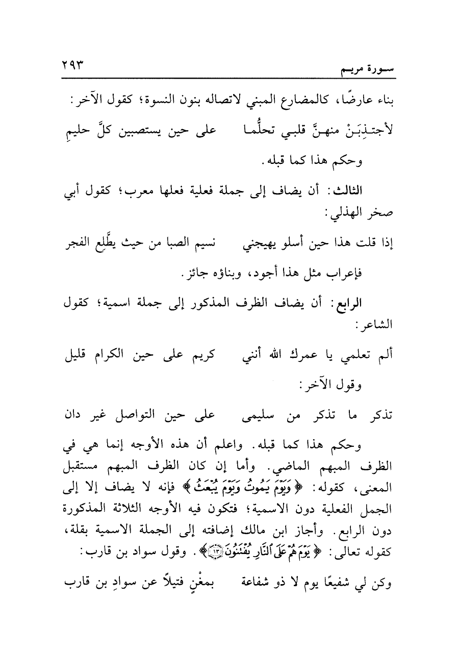 وحكم هذا كما قبله. واعلم أن هذه الأوجه إنما هي في الظرف المبهم الماضي. وأما إن كان الظرف المبهم مستقبل المعنى، كقوله: {وَيَوْمَ يَمُوتُ وَيَوْمَ يُبْعَثُ} فإنه لا يضاف إلا إلى الجمل الفعلية دون الاسمية؛ فتكون فيه الأوجه الثلاثة المذكورة دون الرابع. وأجاز ابن مالك إضافته إلى الجملة الاسمية بقلة، كقوله تعالى: {يَوْمَ هُمْ عَلَى النَّارِ يُفْتَنُونَ (١٣)}. وقول سواد بن قارب: