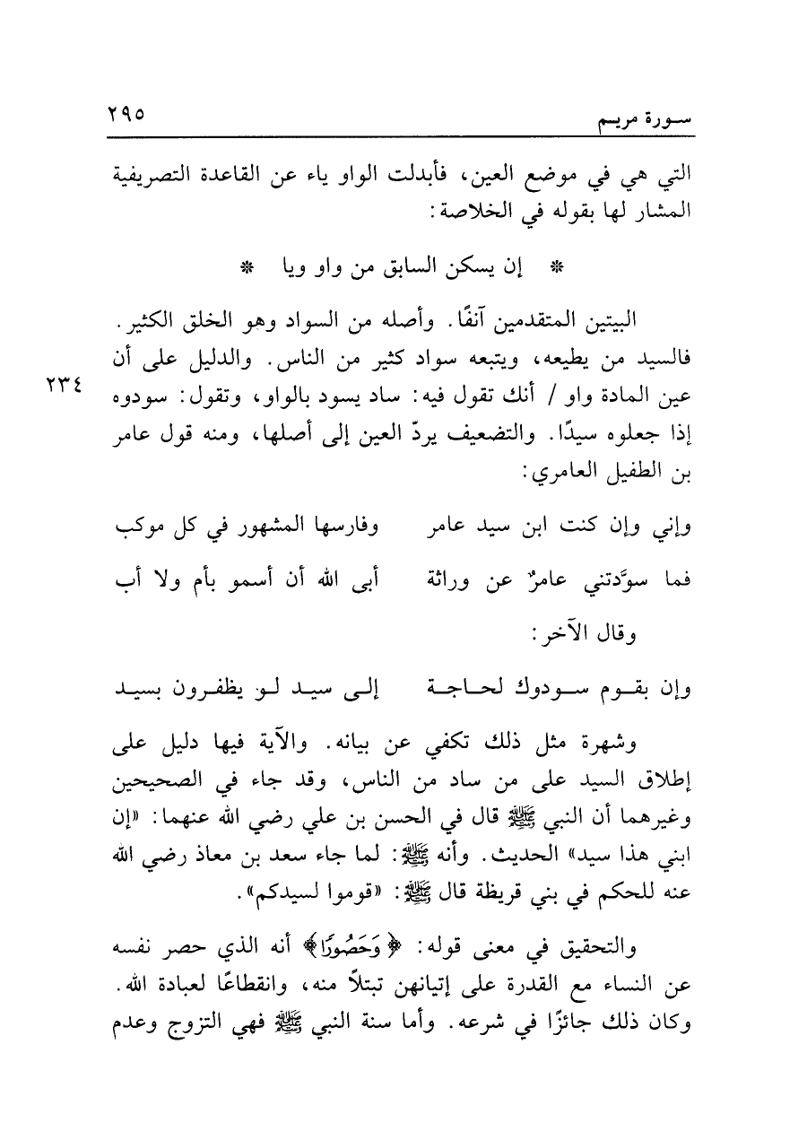 وشهرة مثل ذلك تكفي عن بيانه. والآية فيها دليل على إطلاق السيد على من ساد من الناس، وقد جاء في الصحيحين وغيرهما أن النبي - صلى الله عليه وسلم - قال في الحسن بن علي رضي الله عنهما: "إن ابني هذا سيد" الحديث. وأنه - صلى الله عليه وسلم -: لما جاء سعد بن معاذ رضي الله عنه للحكم في بني قريظة قال - صلى الله عليه وسلم -: "قوموا لسيدكم".