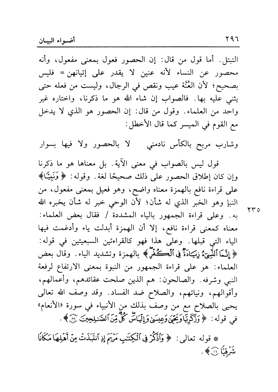 قول ليس بالصواب في معنى الآية. بل معناها هو ما ذكرنا وإن كان إطلاق الحصور على ذلك صحيحًا لغة. وقوله: {وَنَبِيًّا} على قراءة نافع بالهمزة معناه واضح، وهو فعيل بمعنى مفعول، من النبإ وهو الخبر الذي له شأن؛ لأن الوحى خبر له شأن يخبره الله به. وعلى قراءة الجمهور بالياء المشددة فقال بعض العلماء: معناه كمعنى قراءة نافع، إلا أن الهمزة أبدلت ياء وأدغمت فيها الياء التي قبلها. وعلى هذا فهو كالقراءتين السبعيتين في قوله: {إِنَّمَا النَّسِيءُ زِيَادَةٌ فِي الْكُفْرِ} بالهمزة وتشديد الياء. وقال بعض العلماء: هو على قراءة الجمهور من النبوة بمعنى الارتفاع لرفعة النبي وشرفه. والصالحون: هم الذين صلحت عقائدهم، وأعمالهم، وأقوالهم، ونياتهم، والصلاح ضد الفساد. وقد وصف الله تعالى يحيى بالصلاح مع من وصف بذلك من الأنبياء في سورة "الأنعام" في قوله: {وَزَكَرِيَّا وَيَحْيَى وَعِيسَى وَإِلْيَاسَ كُلٌّ مِنَ الصَّالِحِينَ (٨٥)}.