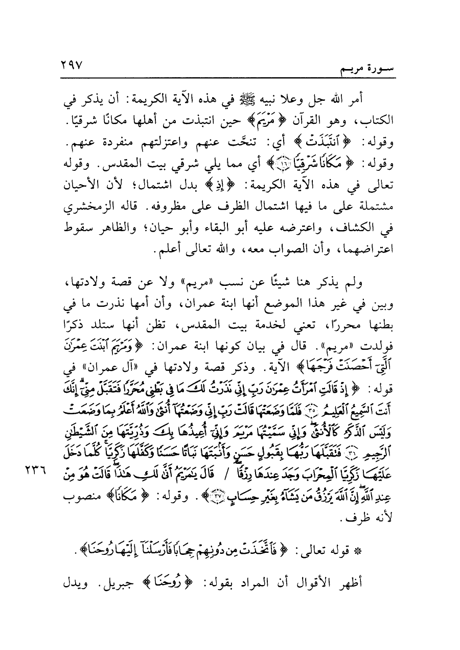 أمر الله جل وعلا نبيه - صلى الله عليه وسلم - في هذه الآية الكريمة: أن يذكر في الكتاب، وهو القرآن {مَرْيَمَ} حين انتبذت من أهلها مكانًا شرقيًّا. وقوله: {انْتَبَذَتْ} أي: تنحَّت عنهم واعتزلتهم منفردة عنهم. وقوله: {مَكَانًا شَرْقِيًّا (١٦)} أي مما يلي شرقي بيت المقدس. وقوله تعالى في هذه الآية الكريمة: {إِذِ} بدل اشتمال؛ لأن الأحيان مشتملة على ما فيها اشتمال الظرف على مظروفه. قاله الزمخشري في الكشاف، واعترضه عليه أبو البقاء وأبو حيان؛ والظاهر سقوط اعتراضهما، وأن الصواب معه، والله تعالى أعلم.
