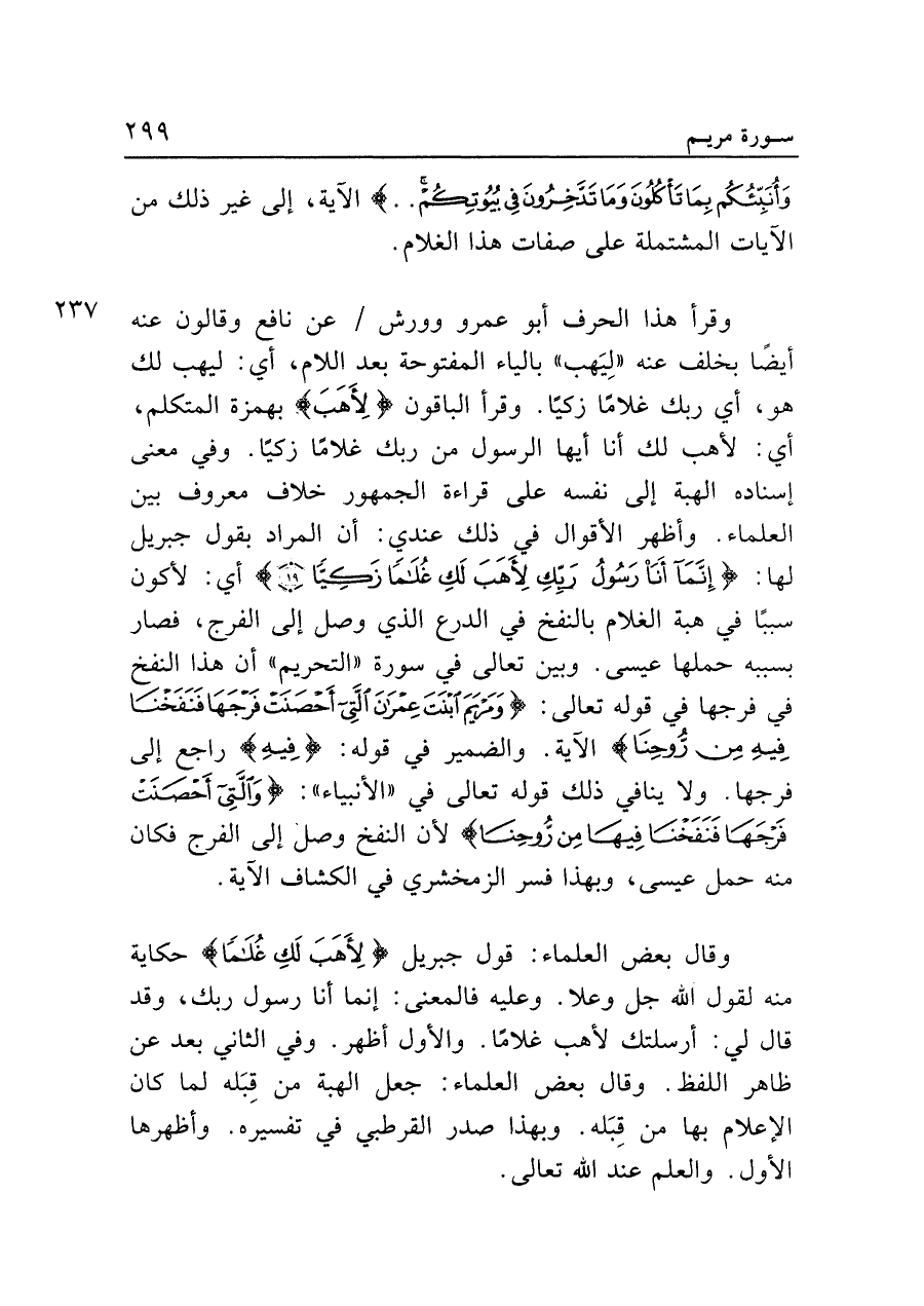 وقرأ هذا الحرف أبو عمرو وورش عن نافع وقالون عنه أيضًا بخلف عنه "لِيَهب" بالياء المفتوحة بعد اللام، أي: ليهب لك هو، أي ربك غلامًا زكيًّا. وقرأ الباقون {لِأَهَبَ} بهمزة المتكلم، أي: لأهب لك أنا أيها الرسول من ربك غلامًا زكيًّا. وفي معنى إسناده الهبة إلى نفسه على قراءة الجمهور خلاف معروف بين العلماء. وأظهر الأقوال في ذلك عندي: أن المراد بقول جبريل لها: {إِنَّمَا أَنَا رَسُولُ رَبِّكِ لِأَهَبَ لَكِ غُلَامًا زَكِيًّا (١٩)} أي: لأكون سببًا في هبة الغلام بالنفخ في الدرع الذي وصل إلى الفرج، فصار بسببه حملها عيسى. وبين تعالى في سورة "التحريم" أن هذا النفخ في فرجها في قوله تعالى: {وَمَرْيَمَ ابْنَتَ عِمْرَانَ الَّتِي أَحْصَنَتْ فَرْجَهَا فَنَفَخْنَا فِيهِ مِنْ رُوحِنَا} الآية. والضمير في قوله: {فِيهِ} راجع إلى فرجها. ولا ينافي ذلك قوله تعالى في "الأنبياء": {الَّتِي أَحْصَنَتْ فَرْجَهَا فَنَفَخْنَا فِيهِ مِنْ رُوحِنَا} لأن النفخ وصل إلى الفرج فكان منه حمل عيسى، وبهذا فسر الزمخشري في الكشاف الآية.