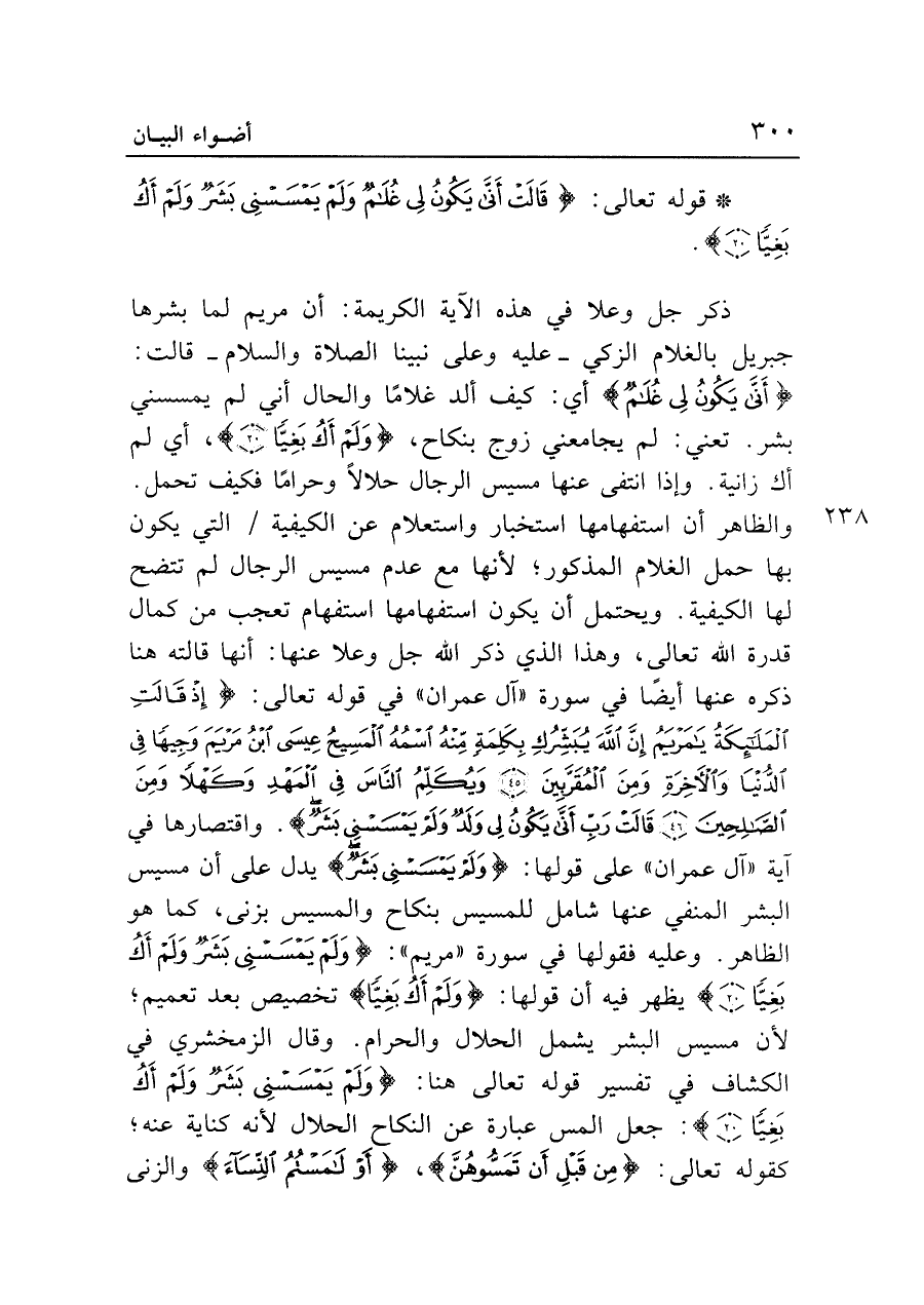 ذكر جل وعلا في هذه الآية الكريمة: أن مريم لما بشرها جبريل بالغلام الزكي -عليه وعلى نبينا الصلاة والسلام- قالت: {أَنَّى يَكُونُ لِي غُلَامٌ} أي: كيف ألد غلامًا والحال أني لم يمسسني بشر. تعني: لم يجامعني زوج بنكاح، {وَلَمْ أَكُ بَغِيًّا (٢٠)}، أي لم أك زانية. وإذا انتفى عنها مسيس الرجال حلالًا وحرامًا فكيف تحمل. والظاهر أن استفهامها استخبار واستعلام عن الكيفية التي يكون بها حمل الغلام المذكور؛ لأنها مع عدم مسيس الرجال لم تتضح لها الكيفية. ويحتمل أن يكون استفهامها استفهام تعجب من كمال قدرة الله تعالى، وهذا الذي ذكر الله جل وعلا عنها: أنها قالته هنا ذكره عنها أيضًا في سورة "آل عمران" في قوله تعالى: {إِذْ قَالتِ الْمَلَائِكَةُ يَامَرْيَمُ إِنَّ اللَّهَ يُبَشِّرُكِ بِكَلِمَةٍ مِنْهُ اسْمُهُ الْمَسِيحُ عِيسَى ابْنُ مَرْيَمَ وَجِيهًا فِي الدُّنْيَا وَالْآخِرَةِ وَمِنَ الْمُقَرَّبِينَ (٤٥) وَيُكَلِّمُ النَّاسَ فِي الْمَهْدِ وَكَهْلًا وَمِنَ الصَّالِحِينَ (٤٦) قَالتْ رَبِّ أَنَّى يَكُونُ لِي وَلَدٌ وَلَمْ يَمْسَسْنِي بَشَرٌ}. واقتصارها في آية "آل عمران" على قولها: {وَلَمْ يَمْسَسْنِي بَشَرٌ} يدل على أن مسيس البشر المنفي عنها شامل للمسيس بنكاح والمسيس بزنى، كما هو الظاهر. وعليه فقولها في سورة "مريم": {وَلَمْ يَمْسَسْنِي بَشَرٌ وَلَمْ أَكُ بَغِيًّا (٢٠)} يظهر فيه أن قولها: {وَلَمْ أَكُ بَغِيًّا} تخصيص بعد تعميم؛ لأن مسيس البشر يشمل الحلال والحرام. وقال الزمخشري في الكشاف في تفسير قوله تعالى هنا: {وَلَمْ يَمْسَسْنِي بَشَرٌ وَلَمْ أَكُ بَغِيًّا (٢٠)}: جعل المس عبارة عن النكاح الحلال لأنه كناية عنه؛ كقوله تعالى: {مِنْ قَبْلِ أَنْ تَمَسُّوهُنَّ}، {أَوْ لَامَسْتُمُ النِّسَاءَ} والزنى