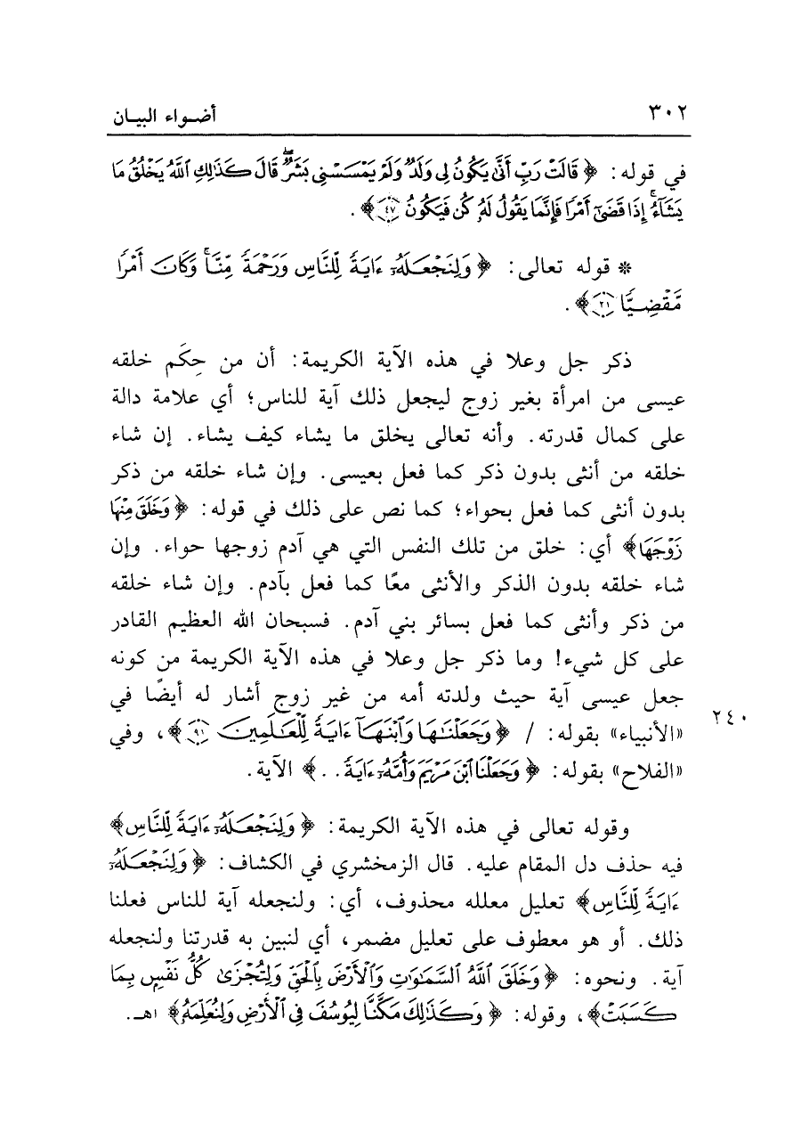 ذكر جل وعلا في هذه الآية الكريمة: أن من حِكَم خلقه عيسى من امرأة بغير زوج ليجعل ذلك آية للناس؛ أي علامة دالة على كمال قدرته. وأنه تعالى يخلق ما يشاء كيف يشاء. إن شاء خلقه من أنثى بدون ذكر كما فعل بعيسى. وإن شاء خلقه من ذكر بدون أنثى كما فعل بحواء؛ كما نص على ذلك في قوله: {وَخَلَقَ مِنْهَا زَوْجَهَا} أي: خلق من تلك النفس التي هي آدم زوجها حواء. وإن شاء خلقه بدون الذكر والأنثى معًا كما فعل بآدم. وإن شاء خلقه من ذكر وأنثى كما فعل بسائر بني آدم. فسبحان الله العظيم القادر على كل شيء! وما ذكر جل وعلا في هذه الآية الكريمة من كونه جعل عيسى آية حيث ولدته أمه من غير زوج أشار له أيضًا في "الأنبياء" بقوله: {وَجَعَلْنَاهَا وَابْنَهَا آيَةً لِلْعَالمِينَ (٩١)}، وفي "الفلاح" بقوله: {وَجَعَلْنَا ابْنَ مَرْيَمَ وَأُمَّهُ آيَةً .. } الآية.