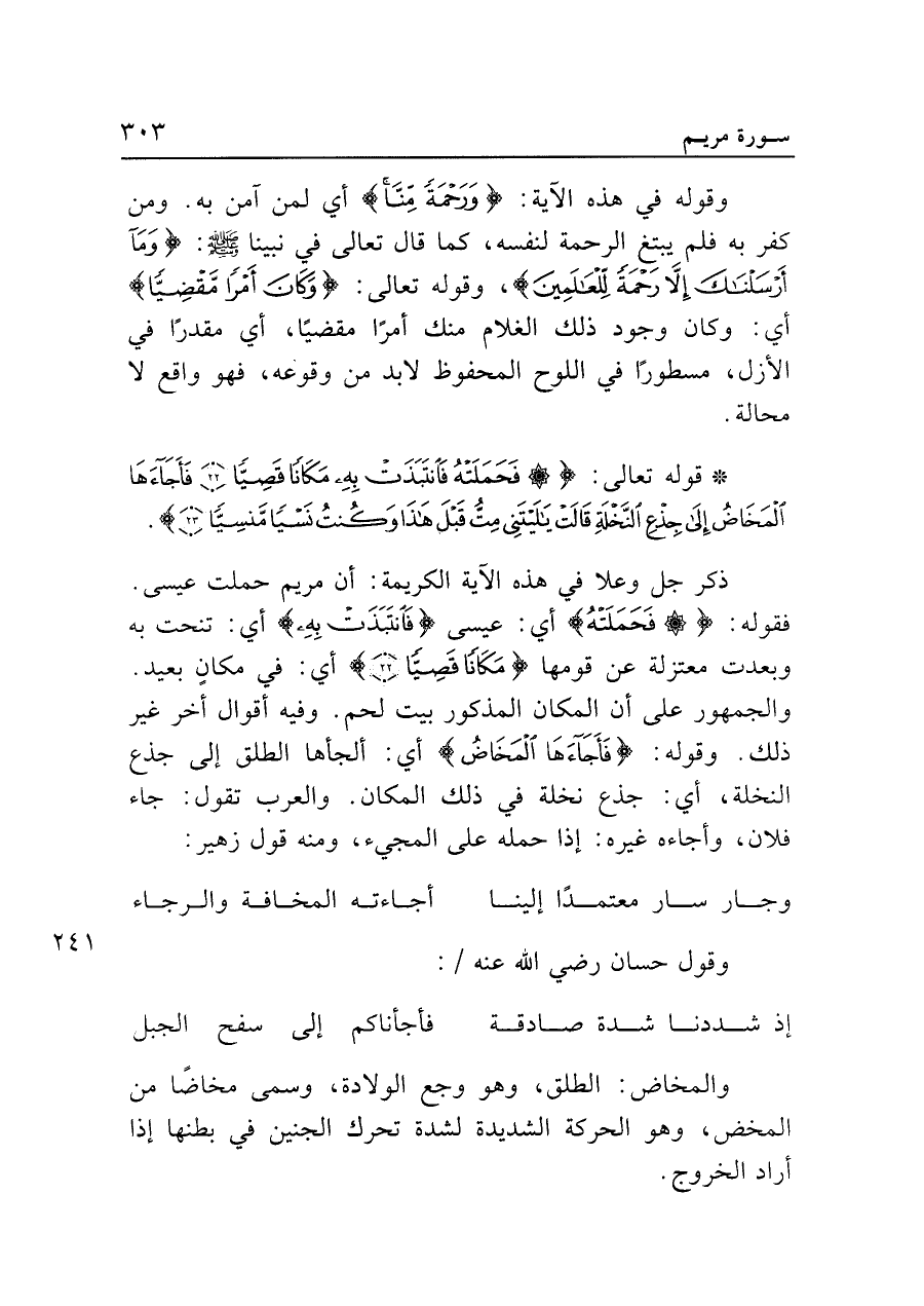 • قوله تعالى: {فَحَمَلَتْهُ فَانْتَبَذَتْ بِهِ مَكَانًا قَصِيًّا (٢٢) فَأَجَاءَهَا الْمَخَاضُ إِلَى جِذْعِ النَّخْلَةِ قَالتْ يَاليتَنِي مِتُّ قَبْلَ هَذَا وَكُنْتُ نَسْيًا مَنْسِيًّا (٢٣)}.