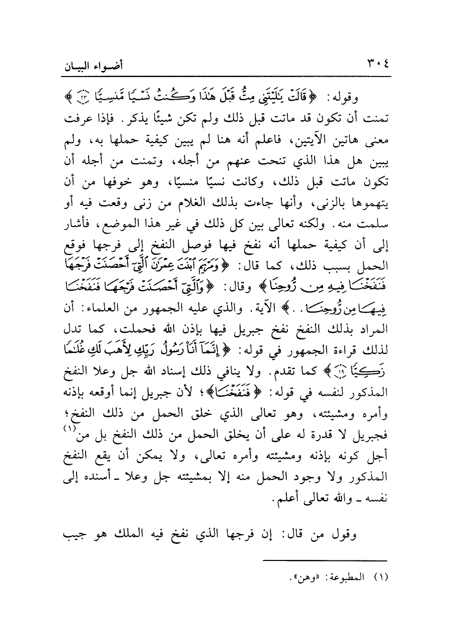 وقوله: {قَالتْ يَاليتَنِي مِتُّ قَبْلَ هَذَا وَكُنْتُ نَسْيًا مَنْسِيًّا (٢٣) } تمنت أن تكون قد ماتت قبل ذلك ولم تكن شيئًا يذكر. فإذا عرفت معنى هاتين الآيتين، فاعلم أنه هنا لم يبين كيفية حملها به، ولم يبين هل هذا الذي تنحت عنهم من أجله، وتمنت من أجله أن تكون ماتت قبل ذلك، وكانت نسيًا منسيًّا، وهو خوفها من أن يتهموها بالزنى، وأنها جاءت بذلك الغلام من زنى وقعت فيه أو سلمت منه. ولكنه تعالى بين كل ذلك في غير هذا الموضع، فأشار إلى أن كيفية حملها أنه نفخ فيها فوصل النفخ إلى فرجها فوقع الحمل بسبب ذلك، كما قال: {وَمَرْيَمَ ابْنَتَ عِمْرَانَ الَّتِي أَحْصَنَتْ فَرْجَهَا فَنَفَخْنَا فِيهِ مِنْ رُوحِنَا} وقال: {الَّتِي أَحْصَنَتْ فَرْجَهَا فَنَفَخْنَا فِيهِ مِنْ رُوحِنَا .. } الآية. والذي عليه الجمهور من العلماء: أن المراد بذلك النفخ نفخ جبريل فيها بإذن الله فحملت، كما تدل لذلك قراءة الجمهور في قوله: {إِنَّمَا أَنَا رَسُولُ رَبِّكِ لِأَهَبَ لَكِ غُلَامًا زَكِيًّا (١٩) } كما تقدم. ولا ينافي ذلك إسناد الله جل وعلا النفخ المذكور لنفسه في قوله: {فَنَفَخْنَا}؛ لأن جبريل إنما أوقعه بإذنه وأمره ومشيئته، وهو تعالى الذي خلق الحمل من ذلك النفخ؛ فجبريل لا قدرة له على أن يخلق الحمل من ذلك النفخ بل من (¬١) أجل كونه بإذنه ومشيئته وأمره تعالى، ولا يمكن أن يقع النفخ المذكور ولا وجود الحمل منه إلا بمشيئته جل وعلا -أسنده إلى نفسه- والله تعالى أعلم.