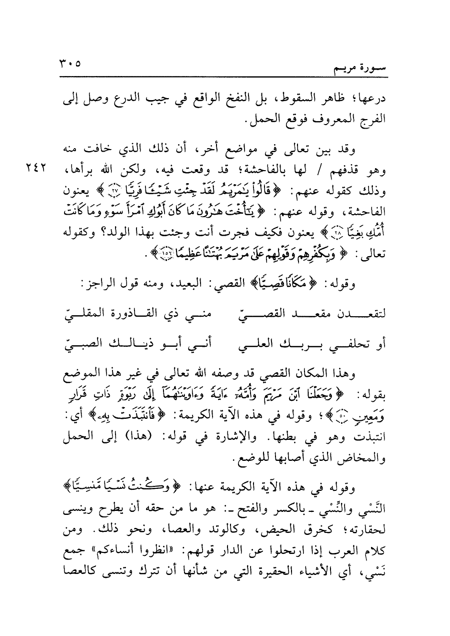 وهذا المكان القصي قد وصفه الله تعالى في غير هذا الموضع بقوله: {وَجَعَلْنَا ابْنَ مَرْيَمَ وَأُمَّهُ آيَةً وَآوَينَاهُمَا إِلَى رَبْوَةٍ ذَاتِ قَرَارٍ وَمَعِينٍ (٥٠)}؛ وقوله في هذه الآية الكريمة: {فَانْتَبَذَتْ بِهِ} أي: انتبذت وهو في بطنها. والإشارة في قوله: (هذا) إلى الحمل والمخاض الذي أصابها للوضع.