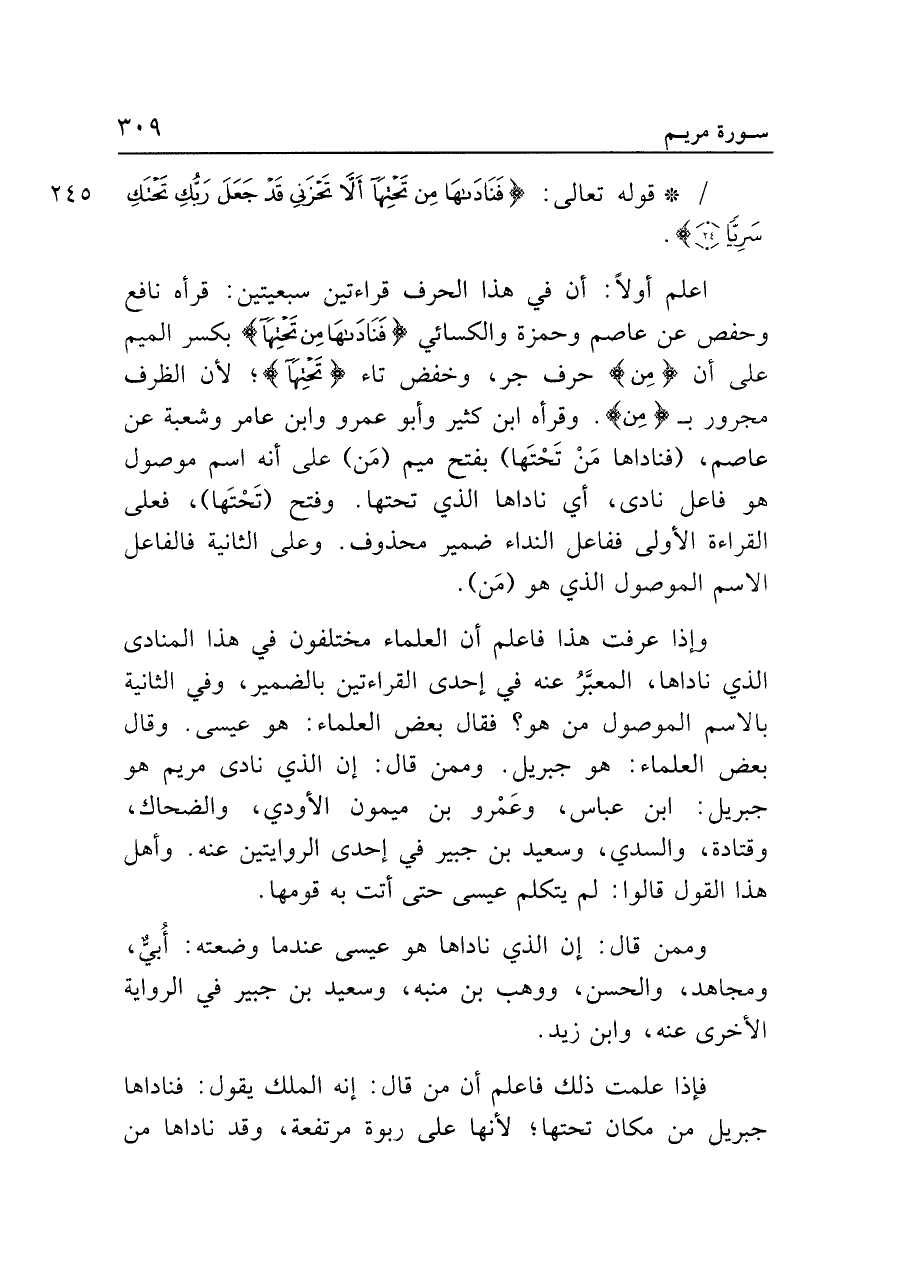 اعلم أولًا: أن في هذا الحرف قراءتين سبعيتين: قرأه نافع وحفص عن عاصم وحمزة والكسائي {فَنَادَاهَا مِنْ تَحْتِهَا} بكسر الميم على أن {مِنْ} حرف جر، وخفض تاء {تَحْتِهَا}؛ لأن الظرف مجرور بـ {مِنْ}. وقرأه ابن كثير وأبو عمرو وابن عامر وشعبة عن عاصم، (فناداها مَنْ تَحْتَها) بفتح ميم (مَن) على أنه اسم موصول هو فاعل نادى، أي ناداها الذي تحتها. وفتح (تَحْتَها)، فعلى القراءة الأولى ففاعل النداء ضمير محذوف. وعلى الثانية فالفاعل الاسم الموصول الذي هو (مَن).