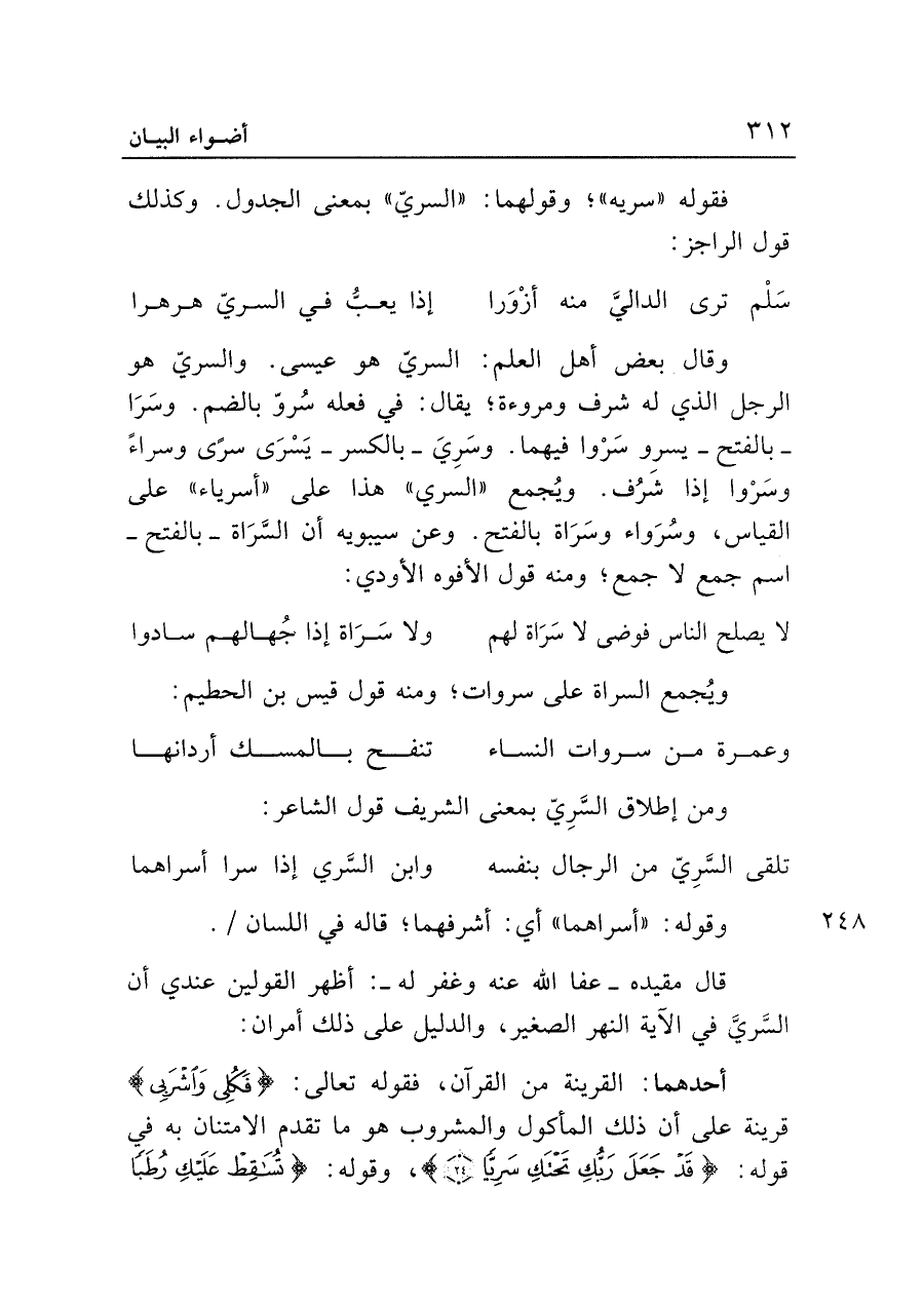 قال مقيده -عفا الله عنه وغفر له-: أظهر القولين عندي أن السَّريَّ في الآية النهر الصغير، والدليل على ذلك أمران:
