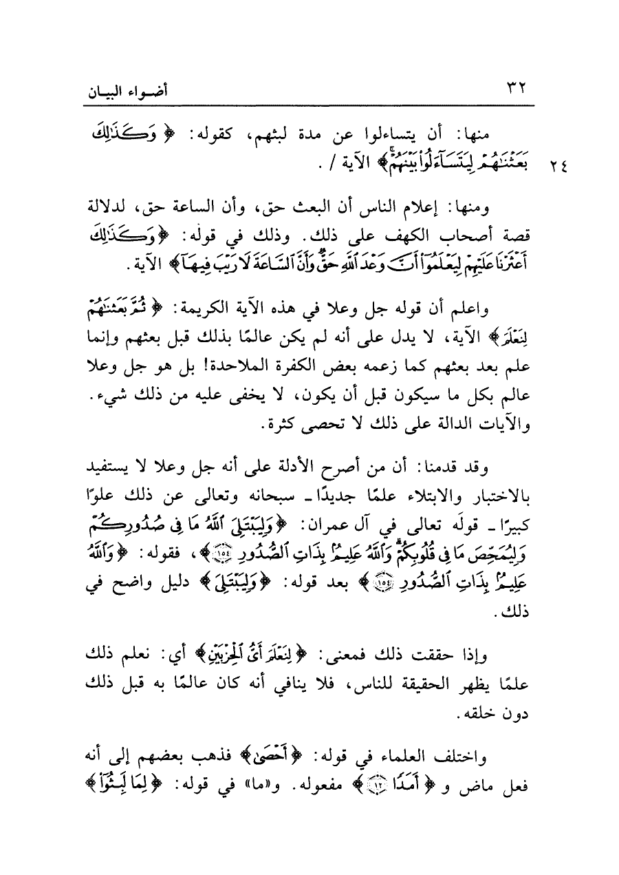وإذا حققت ذلك فمعنى: {لِنَعْلَمَ أَيُّ الْحِزْبَيْنِ} أي: نعلم ذلك علمًا يظهر الحقيقة للناس، فلا ينافي أنه كان عالمًا به قبل ذلك دون خلقه.