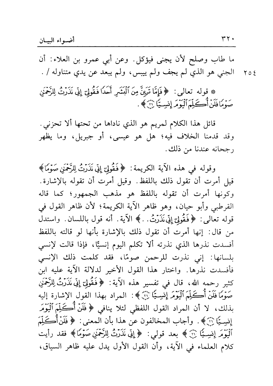 وقوله في هذه الآية الكريمة: {فَقُولِي إِنِّي نَذَرْتُ لِلرَّحْمَنِ صَوْمًا} قيل أمرت أن تقول ذلك باللفظ. وقيل أمرت أن تقوله بالإشارة. وكونها أمرت أن تقوله باللفظ هو مذهب الجمهور؛ كما قاله القرطبي وأبو حيان، وهو ظاهر الآية الكريمة؛ لأن ظاهر القول في قوله تعالى: {فَقُولِي إِنِّي نَذَرْتُ ... } الآية. أنه قول باللسان. واستدل من قال: إنها أمرت أن تقول ذلك بالإشارة بأنها لو قالته باللفظ أفسدت نذرها الذي نذرته ألا تكلم اليوم إنسيًّا، فإذا قالت لإنسي بلسانها: إني نذرت للرحمن صومًا، فقد كلمت ذلك الإنسي فأفسدت نذرها. واختار هذا القول الأخير لدلالة الآية عليه ابن كثير رحمه الله، قال في تفسير هذه الآية: {فَقُولِي إِنِّي نَذَرْتُ لِلرَّحْمَنِ صَوْمًا فَلَنْ أُكَلِّمَ الْيَوْمَ إِنْسِيًّا (٢٦)}: المراد بهذا القول الإشارة إليه لذلك، لا أن المراد القول اللفظي لئلا ينافي {فَلَنْ أُكَلِّمَ الْيَوْمَ إِنْسِيًّا (٢٦)}. وأجاب المخالفون عن هذا بأن المعنى: {فَلَنْ أُكَلِّمَ الْيَوْمَ إِنْسِيًّا (٢٦)} بعد قولي: {إِنِّي نَذَرْتُ لِلرَّحْمَنِ صَوْمًا} فقد رأيت كلام العلماء في الآية، وأن القول الأول يدل عليه ظاهر السياق،