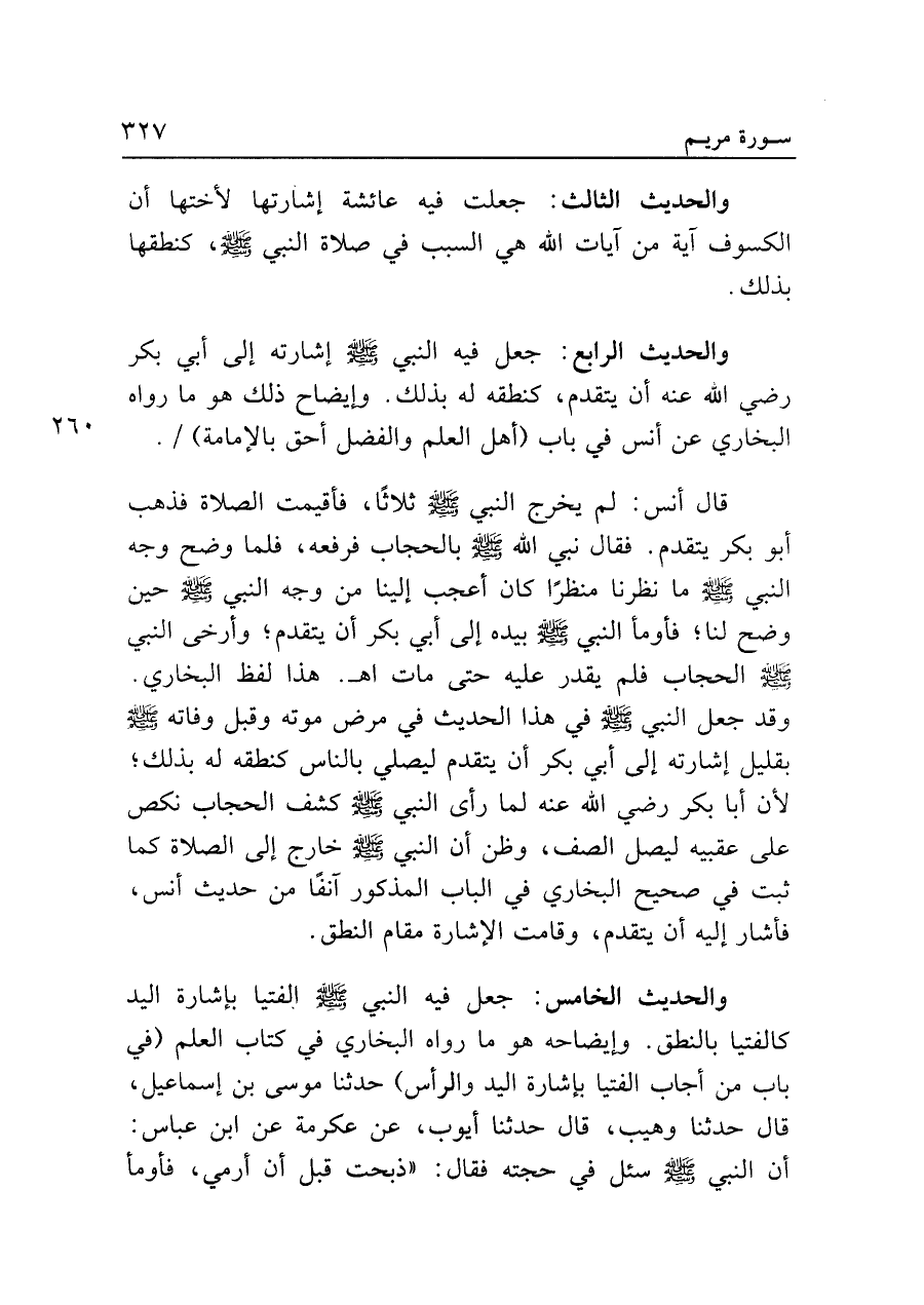 قال أنس: لم يخرج النبي - صلى الله عليه وسلم - ثلاثًا، فأقيمت الصلاة فذهب أبو بكر يتقدم. فقال نبي الله - صلى الله عليه وسلم - بالحجاب فرفعه، فلما وضح وجه النبي - صلى الله عليه وسلم - ما نظرنا منظرا كان أعجب إلينا من وجه النبي - صلى الله عليه وسلم - حين وضح لنا؛ فأومأ النبي - صلى الله عليه وسلم - بيده إلى أبي بكر أن يتقدم؛ وأرخى النبي - صلى الله عليه وسلم - الحجاب فلم يقدر عليه حتى مات اهـ. هذا لفظ البخاري. وقد جعل النبي - صلى الله عليه وسلم - في هذا الحديث في مرض موته وقبل وفاته - صلى الله عليه وسلم - بقليل إشارته إلى أبي بكر أن يتقدم ليصلي بالناس كنطقه له بذلك؛ لأن أبا بكر رضي الله عنه لما رأى النبي - صلى الله عليه وسلم - كشف الحجاب نكص على عقبيه ليصل الصف، وظن أن النبي - صلى الله عليه وسلم - خارج إلى الصلاة كما ثبت في صحيح البخاري في الباب المذكور آنفًا من حديث أنس، فأشار إليه أن يتقدم، وقامت الإشارة مقام النطق.