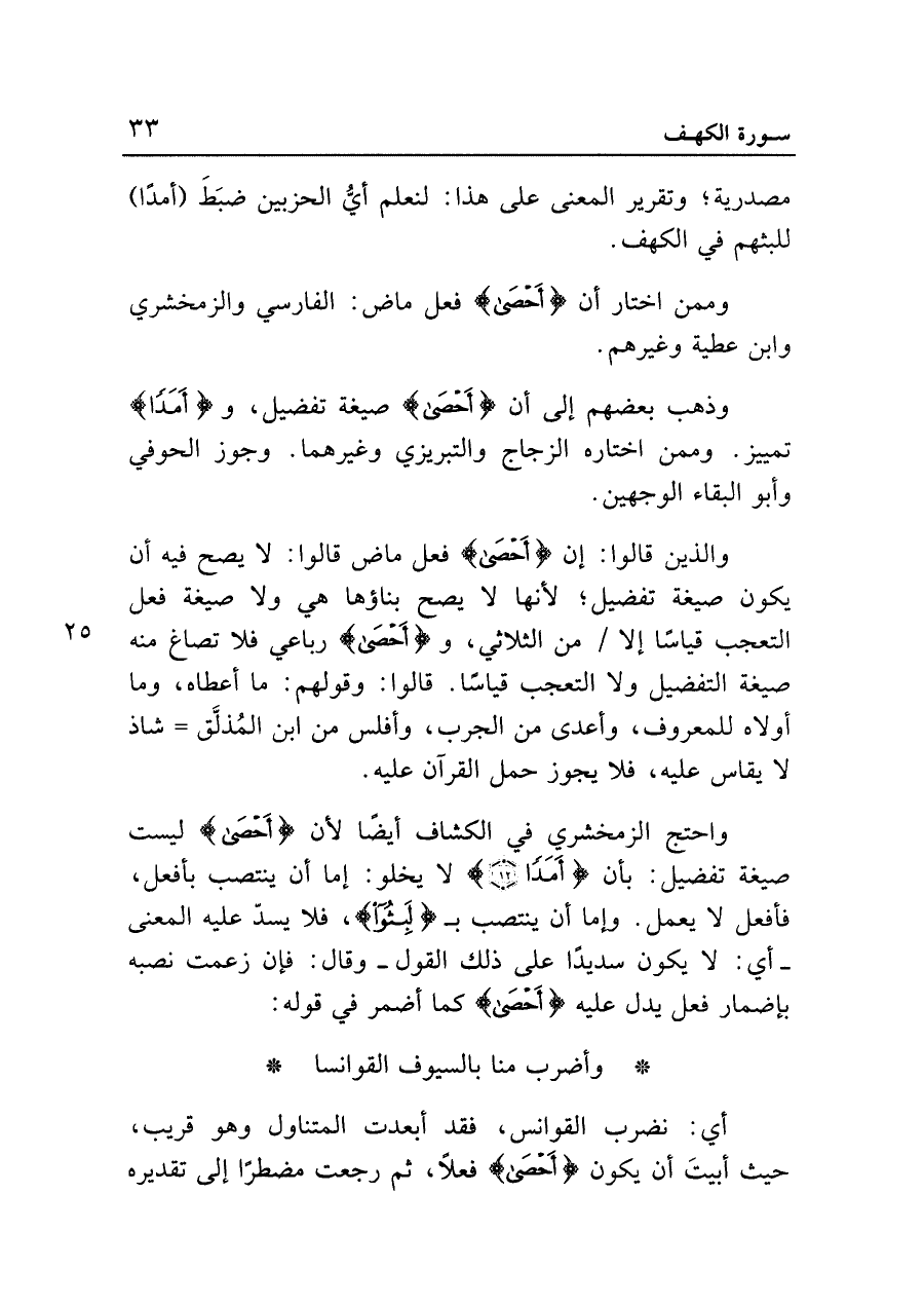واحتج الزمخشري في الكشاف أيضًا لأن {أَحْصَى} ليست صيغة تفضيل: بأن {أَمَدًا (١٢)} لا يخلو: إما أن ينتصب بأفعل، فأفعل لا يعمل. وإما أن ينتصب بـ {لَبِثُوا}، فلا يسدّ عليه المعنى -أي: لا يكون سديدًا على ذلك القول- وقال: فإن زعمت نصبه بإضمار فعل يدل عليه {أَحْصَى} كما أضمر في قوله: