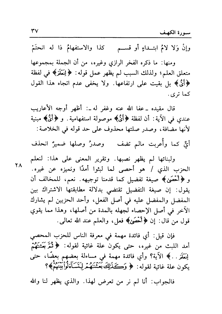 ولبنائها لم يظهر نصبها. وتقرير المعنى على هذا: لنعلم الحزب الذي هو أحصى لما لبثوا أمدًا ونميزه عن غيره. و {أَحْصَى} صيغة تفضيل كما قدمنا توجيهه. نعم، للمخالف أن يقول: إن صيغة التفضيل تقتضي بدلالة مطابقتها الاشتراك بين المفضل والمفضل عليه في أصل الفعل، وأحد الحزبين لم يشارك الآخر في أصل الإحصاء لجهله بالمدة من أصلها، وهذا مما يقوي قول من قال: إن {أَحْصَى} فعل، والعلم عند الله تعالى.