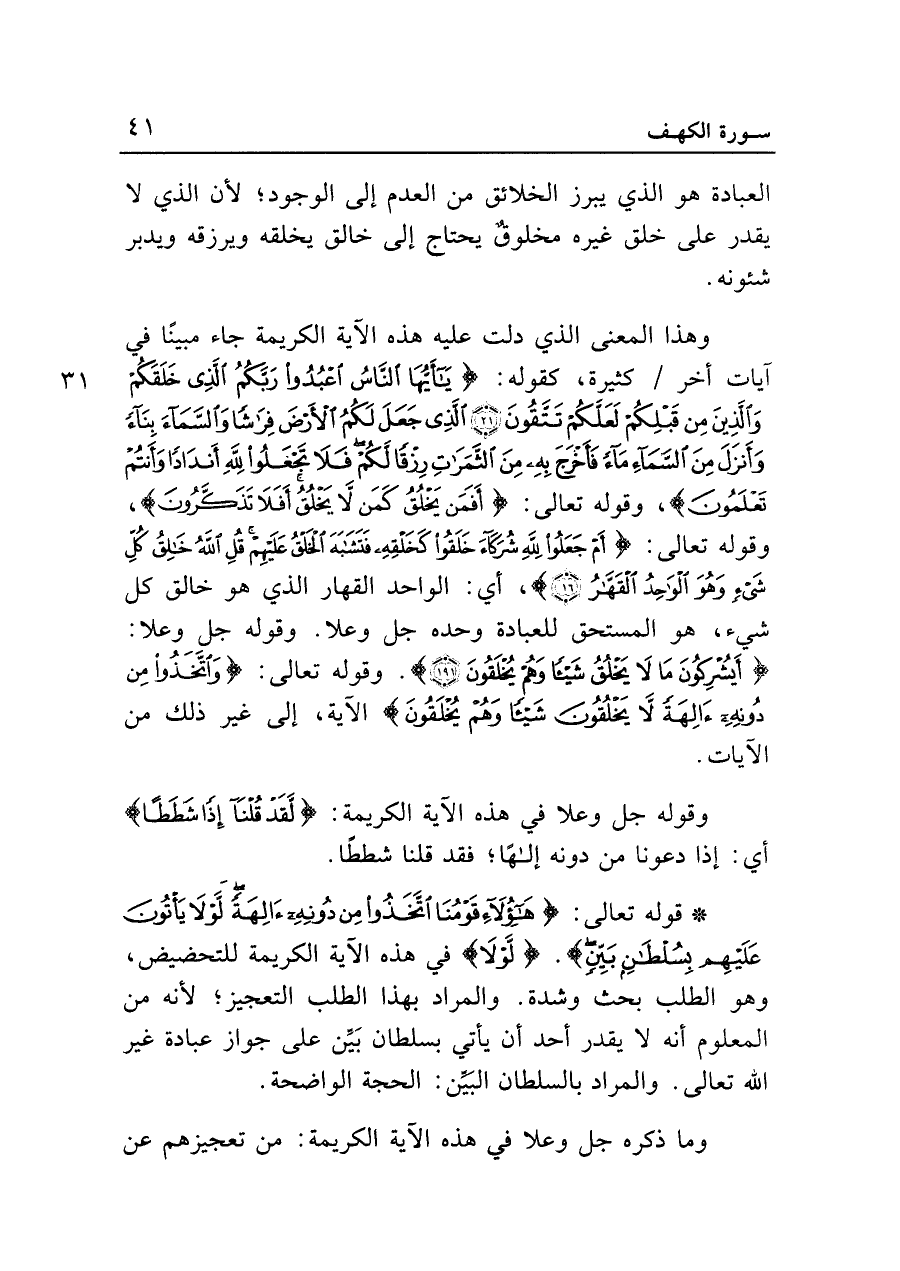 • قوله تعالى: {هَؤُلَاءِ قَوْمُنَا اتَّخَذُوا مِنْ دُونِهِ آلِهَةً لَوْلَا يَأْتُونَ عَلَيْهِمْ بِسُلْطَانٍ بَيِّنٍ}. {لَوْلَا} في هذه الآية الكريمة للتحضيض، وهو الطلب بحث وشدة. والمراد بهذا الطلب التعجيز؛ لأنه من المعلوم أنه لا يقدر أحد أن يأتي بسلطان بَيِّن على جواز عبادة غير الله تعالى. والمراد بالسلطان البيِّن: الحجة الواضحة.