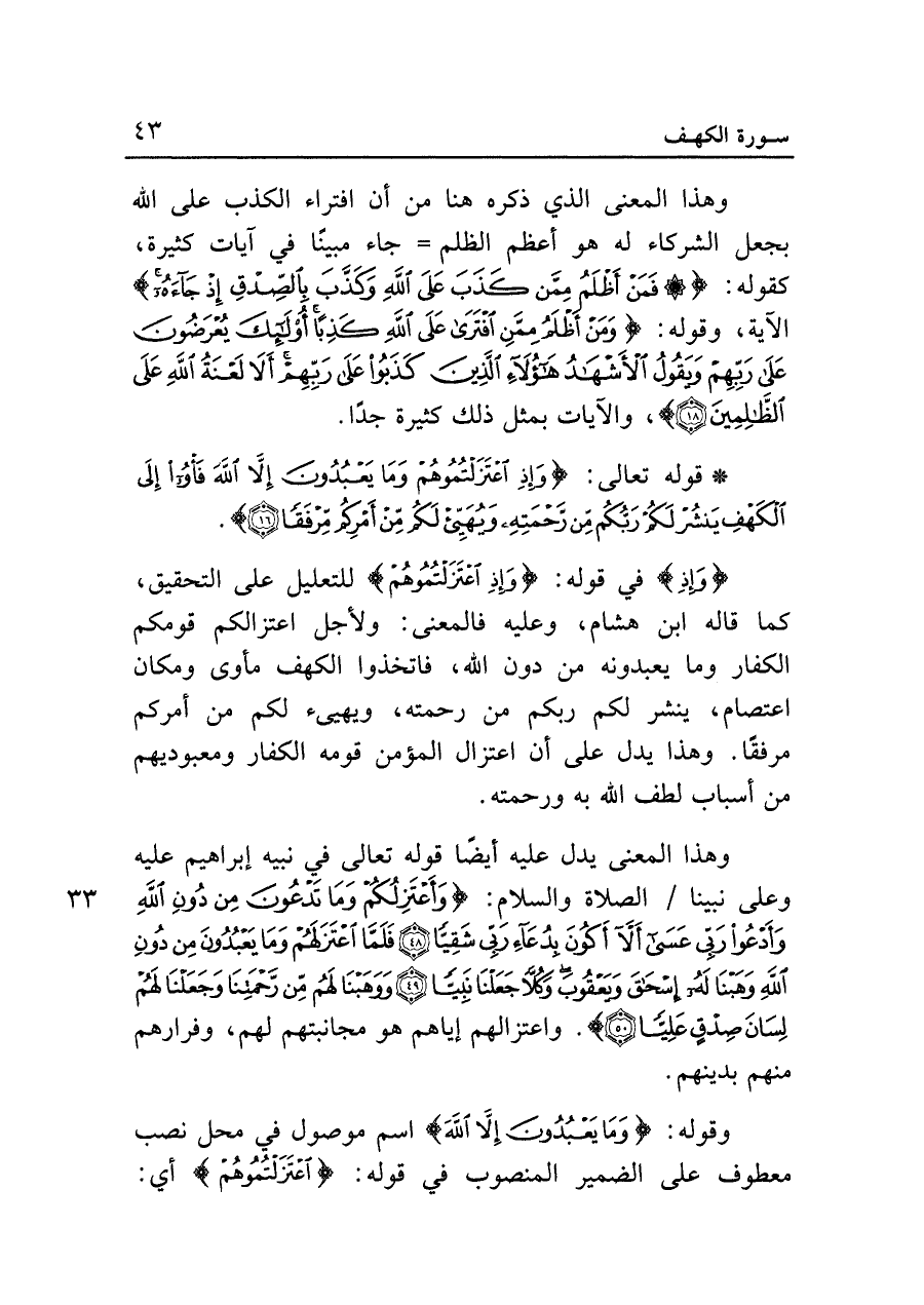 وهذا المعنى يدل عليه أيضًا قوله تعالى في نبيه إبراهيم عليه وعلى نبينا الصلاة والسلام: {وَأَعْتَزِلُكُمْ وَمَا تَدْعُونَ مِنْ دُونِ اللَّهِ وَأَدْعُو رَبِّي عَسَى أَلَّا أَكُونَ بِدُعَاءِ رَبِّي شَقِيًّا (٤٨) فَلَمَّا اعْتَزَلَهُمْ وَمَا يَعْبُدُونَ مِنْ دُونِ اللَّهِ وَهَبْنَا لَهُ إِسْحَاقَ وَيَعْقُوبَ وَكُلًّا جَعَلْنَا نَبِيًّا (٤٩) وَوَهَبْنَا لَهُمْ مِنْ رَحْمَتِنَا وَجَعَلْنَا لَهُمْ لِسَانَ صِدْقٍ عَلِيًّا (٥٠)}. واعتزالهم إياهم هو مجانبتهم لهم، وفرارهم منهم بدينهم.