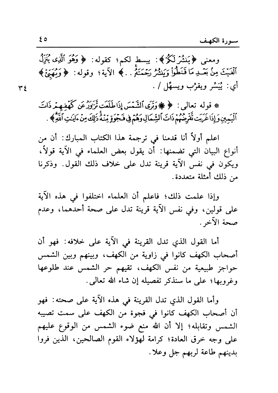 وأما القول الذي تدل القرينة في هذه الآية على صحته: فهو أن أصحاب الكهف كانوا في فجوة من الكهف على سمت تصيبه الشمس وتقابله؛ إلا أن الله منع ضوء الشمس من الوقوع عليهم على وجه خرق العادة؛ كرامة لهؤلاء القوم الصالحين، الذين فروا بدينهم طاعة لربهم جل وعلا.
