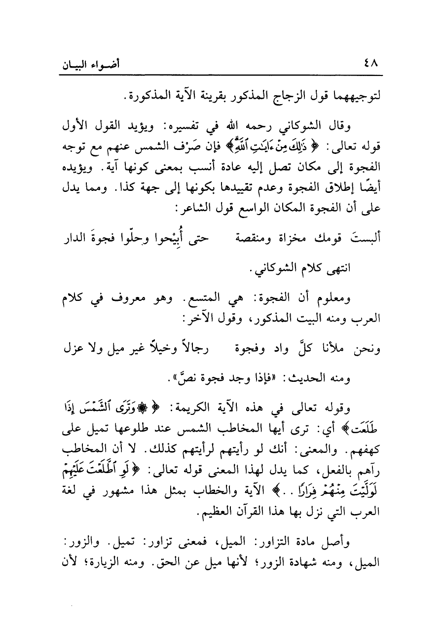 وقال الشوكاني رحمه الله في تفسيره: ويؤيد القول الأول قوله تعالى: {ذَلِكَ مِنْ آيَاتِ اللَّهِ} فإن صَرْف الشمس عنهم مع توجه الفجوة إلى مكان تصل إليه عادة أنسب بمعنى كونها آية. ويؤيده أيضًا إطلاق الفجوة وعدم تقييدها بكونها إلى جهة كذا. ومما يدل على أن الفجوة المكان الواسع قول الشاعر: