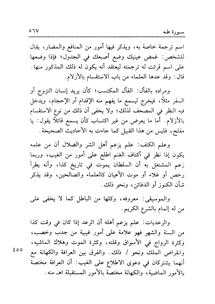 ومراده بالفأل: الفأل المكتسب؛ كأن يريد إنسان التزوج أو السفر مثلًا، فيخرج ليسمع ما يفهم منه الإقدام أو الإحجام، ويدخل فيه النظر في المصحف لذلك؛ ولا يخفى أن ذلك من نوع الاستقسام بالأزلام. أما ما يعرض من غير اكتساب كأن يسمع قائلًا يقول: يا مفلح، فليس من هذا القبيل كما جاءت به الأحاديث الصحيحة.