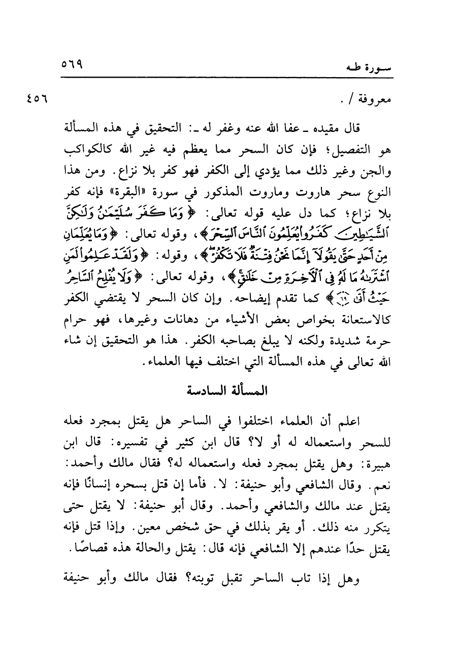 قال مقيده -عفا الله عنه وغفر له-: التحقيق في هذه المسألة هو التفصيل؛ فإن كان السحر مما يعظم فيه غير الله كالكواكب والجن وغير ذلك مما يؤدي إلى الكفر فهو كفر بلا نزاع. ومن هذا النوع سحر هاروت وماروت المذكور في سورة "البقرة" فإنه كفر بلا نزاع؛ كما دل عليه قوله تعالى: {وَمَا كَفَرَ سُلَيمَانُ وَلَكِنَّ الشَّيَاطِينَ كَفَرُوا يُعَلِّمُونَ النَّاسَ السِّحْرَ}، وقوله تعالى: {وَمَا يُعَلِّمَانِ مِنْ أَحَدٍ حَتَّى يَقُولَا إِنَّمَا نَحْنُ فِتْنَةٌ فَلَا تَكْفُرْ}، وقوله: {وَلَقَدْ عَلِمُوا لَمَنِ اشْتَرَاهُ مَا لَهُ فِي الْآخِرَةِ مِنْ خَلَاقٍ}، وقوله تعالى: {وَلَا يُفْلِحُ السَّاحِرُ حَيثُ أَتَى (٦٩)} كما تقدم إيضاحه. وإن كان السحر لا يقتضي الكفر كالاستعانة بخواص بعض الأشياء من دهانات وغيرها، فهو حرام حرمة شديدة ولكنه لا يبلغ بصاحبه الكفر. هذا هو التحقيق إن شاء الله تعالى في هذه المسألة التي اختلف فيها العلماء.