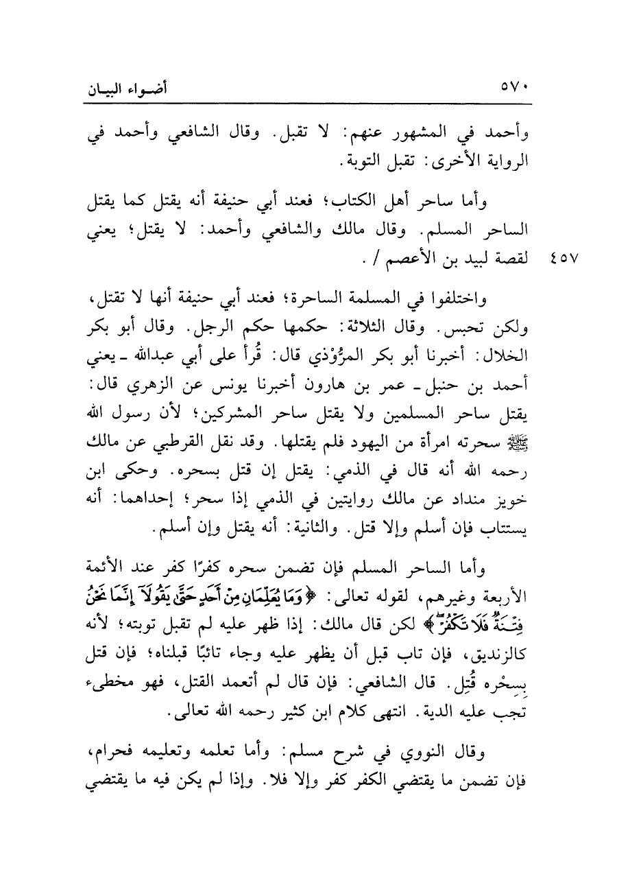 وأما الساحر المسلم فإن تضمن سحره كفرًا كفر عند الأئمة الأربعة وغيرهم، لقوله تعالى: {وَمَا يُعَلِّمَانِ مِنْ أَحَدٍ حَتَّى يَقُولَا إِنَّمَا نَحْنُ فِتْنَةٌ فَلَا تَكْفُرْ} لكن قال مالك: إذا ظهر عليه لم تقبل توبته؛ لأنه كالزنديق، فإن تاب قبل أن يظهر عليه وجاء تائبًا قبلناه؛ فإن قتل بِسِحْره قُتِل. قال الشافعي: فإن قال لم أتعمد القتل، فهو مخطئ تجب عليه الدية. انتهى كلام ابن كثير رحمه الله تعالى.