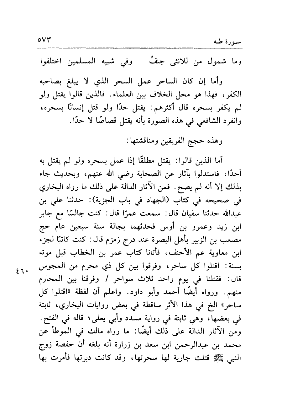 وأما إن كان الساحر عمل السحر الذي لا يبلغ بصاحبه الكفر، فهذا هو محل الخلاف بين العلماء. فالذين قالوا يقتل ولو لم يكفر بسحره قال أكثرهم: يقتل حدا ولو قتك إنسانًا بسحره، وانفرد الشافعي في هذه الصورة بأنه يقتل قصاصًا لا حدًّا.