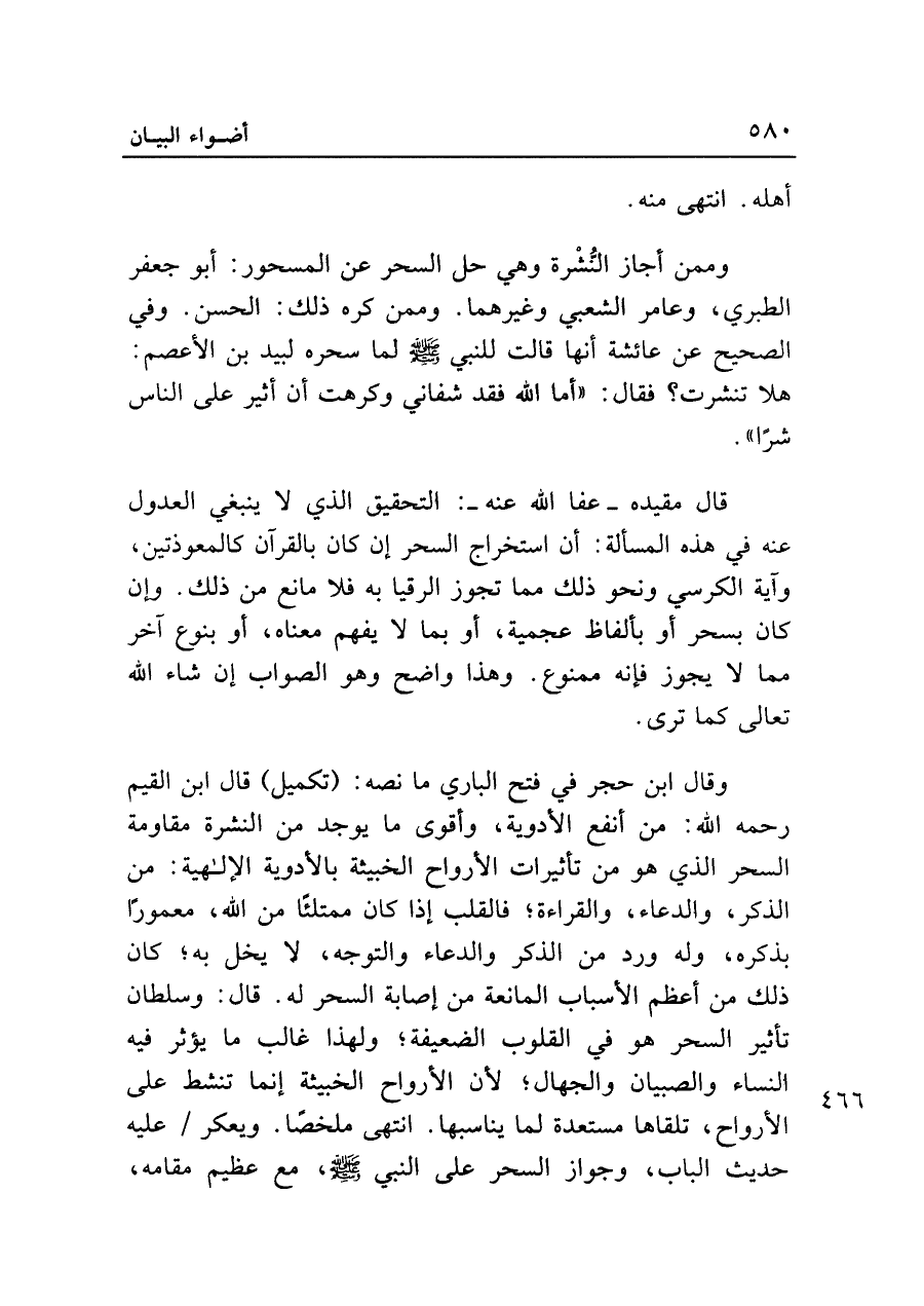 وممن أجاز النُّشْرة وهي حل السحر عن المسحور: أبو جعفر الطبري، وعامر الشعبي وغيرهما. وممن كره ذلك: الحسن. وفي الصحيح عن عائشة أنها قالت للنبي - صلى الله عليه وسلم - لما سحره لبيد بن الأعصم: هلا تنشرت؟ فقال: "أما الله فقد شفاني وكرهت أن أثير على الناس شرًّا".