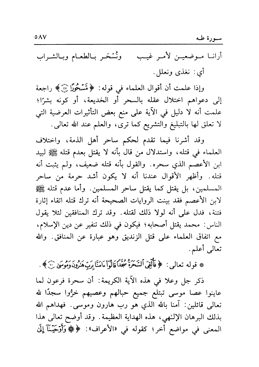 وقد أشرنا فيما تقدم لحكم ساحر أهل الذمة، واختلاف العلماء في قتله، واستدلال من قال بأنه لا يقتل بعدم قتله - صلى الله عليه وسلم - لبيد بن الأعصم الذي سحره. والقول بأنه قتله ضعيف، ولم يثبت أنه قتله. وأظهر الأقوال عندنا أنه لا يكون أشد حرمة من ساحر المسلمين، بل يقتل كما يقتل ساحر المسلمين. وأما عدم قتله - صلى الله عليه وسلم - لابن الأعصم فقد بينت الروايات الصحيحة أنه ترك قتله اتقاء إثارة فتنة، فدل على أنه لولا ذلك لقتله. وقد ترك المنافقين لئلا يقول الناس: محمد يقتل أصحابه؛ فيكون في ذلك تنفير عن دين الإسلام، مع اتفاق العلماء على قتل الزنديق وهو عبارة عن المنافق. والله تعالى أعلم.