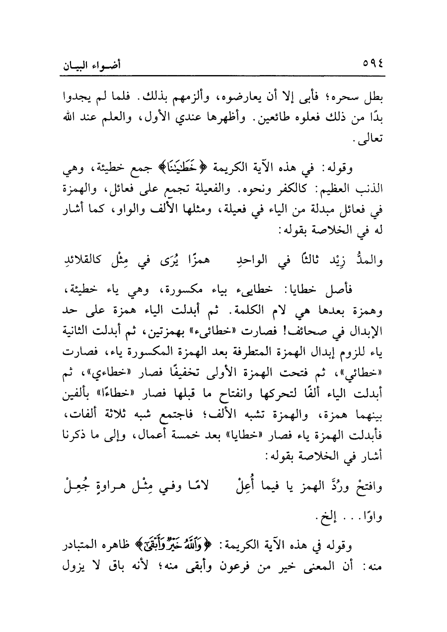 وقوله: في هذه الآية الكريمة {خَطَايَانَا} جمع خطيئة، وهي الذنب العظيم: كالكفر ونحوه. والفعيلة تجمع على فعائل، والهمزة في فعائل مبدلة من الياء في فعيلة، ومثلها الألف والواو، كما أشار له في الخلاصة بقوله: