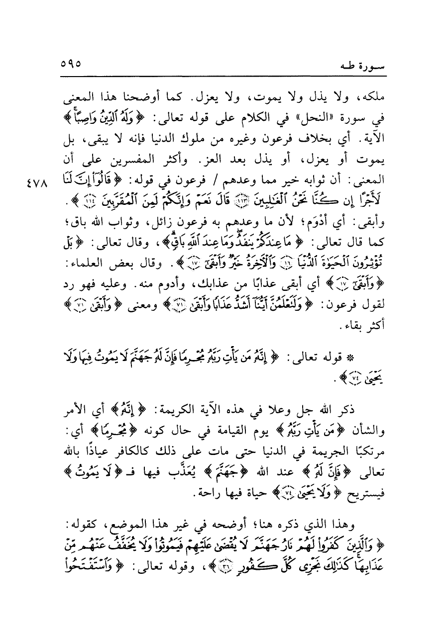 ملكه، ولا يذل ولا يموت، ولا يعزل. كما أوضحنا هذا المعنى في سورة "النحل" في الكلام على قوله تعالى: {وَلَهُ الدِّينُ وَاصِبًا} الآية. أي بخلاف فرعون وغيره من ملوك الدنيا فإنه لا يبقى، بل يموت أو يعزل، أو يذل بعد العز. وأكثر المفسرين على أن المعنى: أن ثوابه خير مما وعدهم فرعون في قوله: {قَالُوا إِنَّ لَنَا لَأَجْرًا إِنْ كُنَّا نَحْنُ الْغَالِبِينَ (١١٣) قَال نَعَمْ وَإِنَّكُمْ لَمِنَ الْمُقَرَّبِينَ (١١٤)}. وأبقى: أي أدْوَم؛ لأن ما وعدهم به فرعون زائل، وثواب الله باق؛ كما قال تعالى: {مَا عِنْدَكُمْ يَنْفَدُ وَمَا عِنْدَ اللَّهِ بَاقٍ} وقال تعالى: {بَلْ تُؤْثِرُونَ الْحَيَاةَ الدُّنْيَا (١٦) وَالْآخِرَةُ خَيرٌ وَأَبْقَى (١٧)}. وقال بعض العلماء: {وَأَبْقَى (١٧)} أي أبقى عذابًا من عذابك، وأدوم منه. وعليه فهو رد لقول فرعون: {وَلَتَعْلَمُنَّ أَيُّنَا أَشَدُّ عَذَابًا وَأَبْقَى (٧١)} ومعنى {وَأَبْقَى (٧١)} أكثر بقاء.